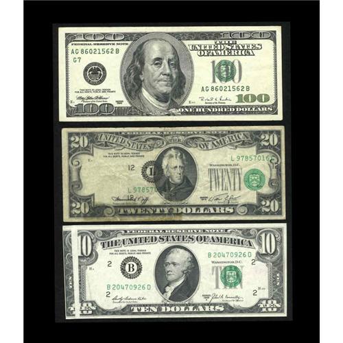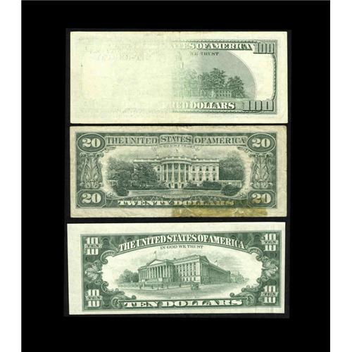 <B>Three Diverse Errors including</B></I> $10 1969A FRN with a 3mm face gutter <B>AU;</B></I> $20 1974 FRN with third printing shifted into the portrait <B>VG,</B></I> stained, edge tears;</B></I> and a $100 1996 FRN with half of its back blank due to inkjet malfunctions <B>XF.</B></I>