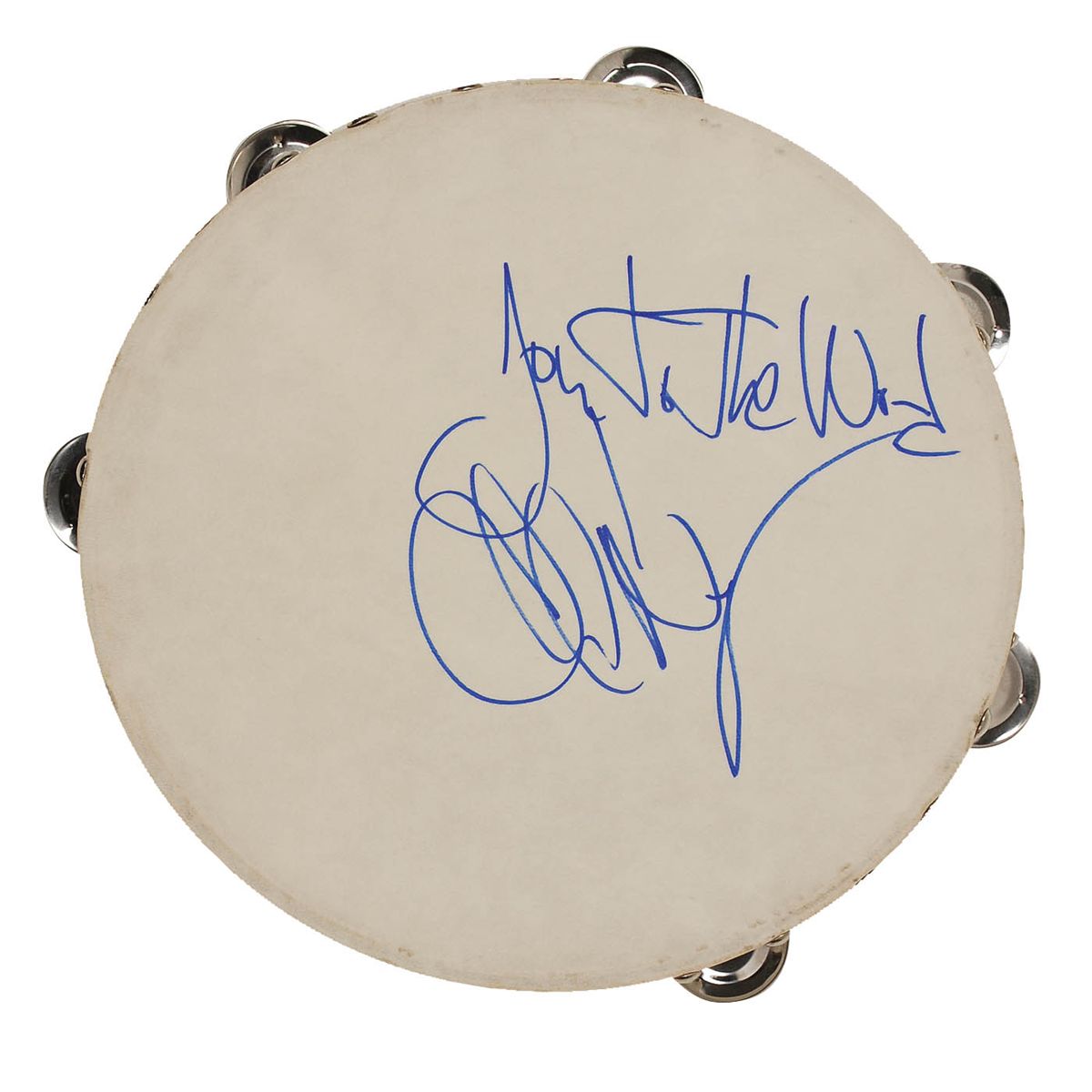 Off-white 10? tambourine, signed on the head in blue felt tip, “Joy to the World, Chuck Negron.” In fine condition.