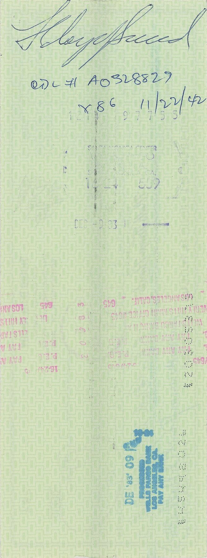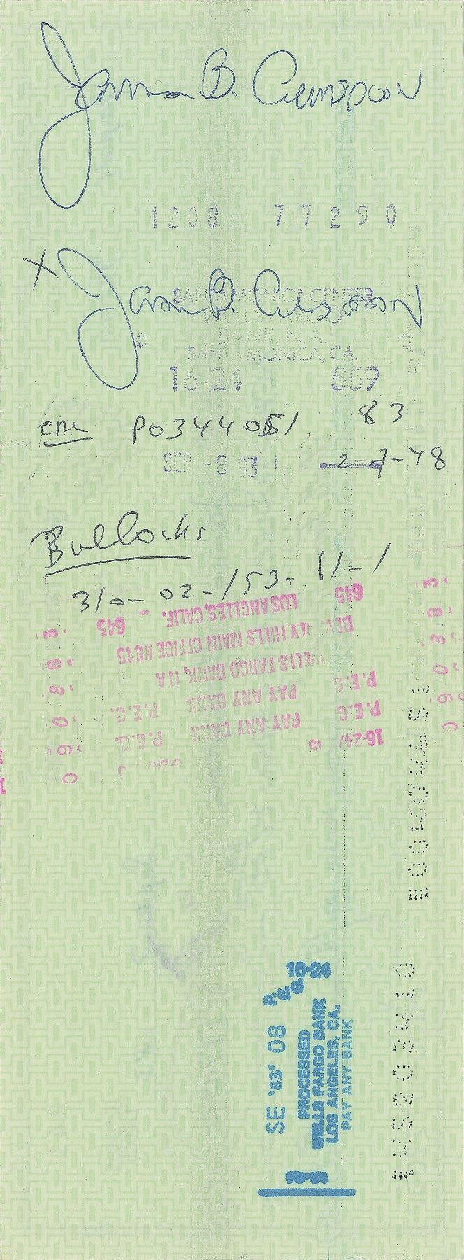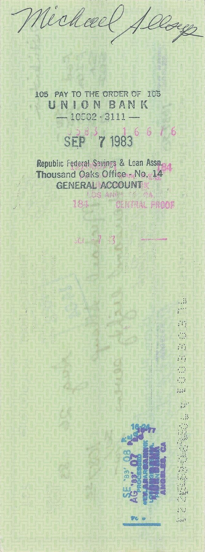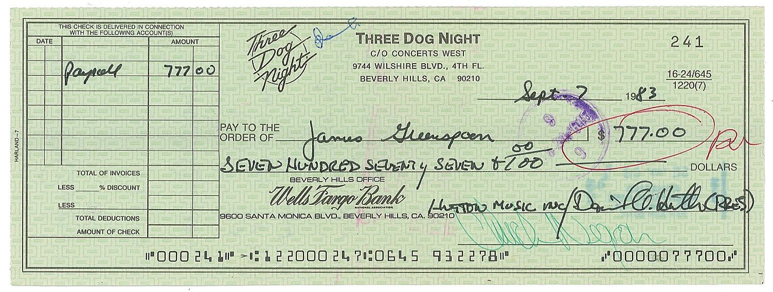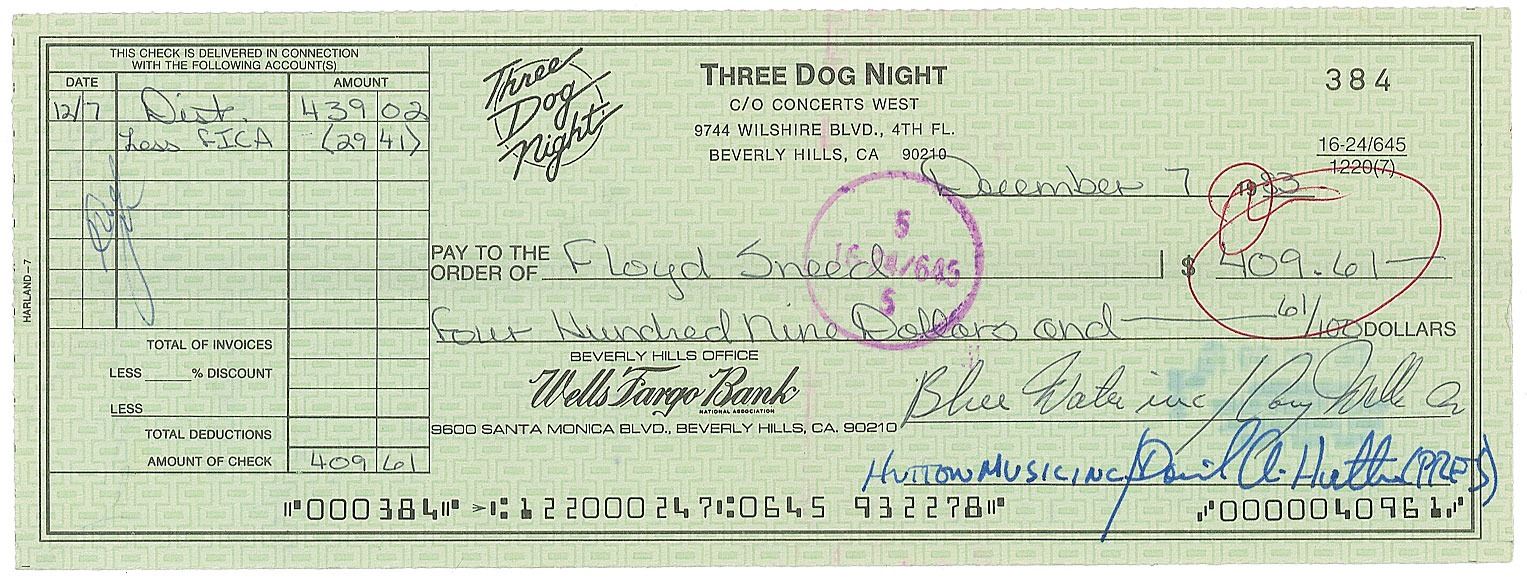 Group of three Three Dog Night business checks, each 8.25 x 3, dated August–September 1983: one is made payable to guitarist Michael Allsup for $1087.50, signed on the front by vocalist Danny Hutton and vocalist Cory Wells, and endorsed on the reverse by Allsup; one is made payable to drummer Floyd Sneed for $409.61, signed on the front by Wells and Hutton, and endorsed on the reverse by Sneed; and one is made payable to keyboardist Jimmy Greenspoon for $777, signed on the front by Hutton and vocalist Chuck Negron, and endorsed twice on the reverse by Greenspoon. In overall fine condition.