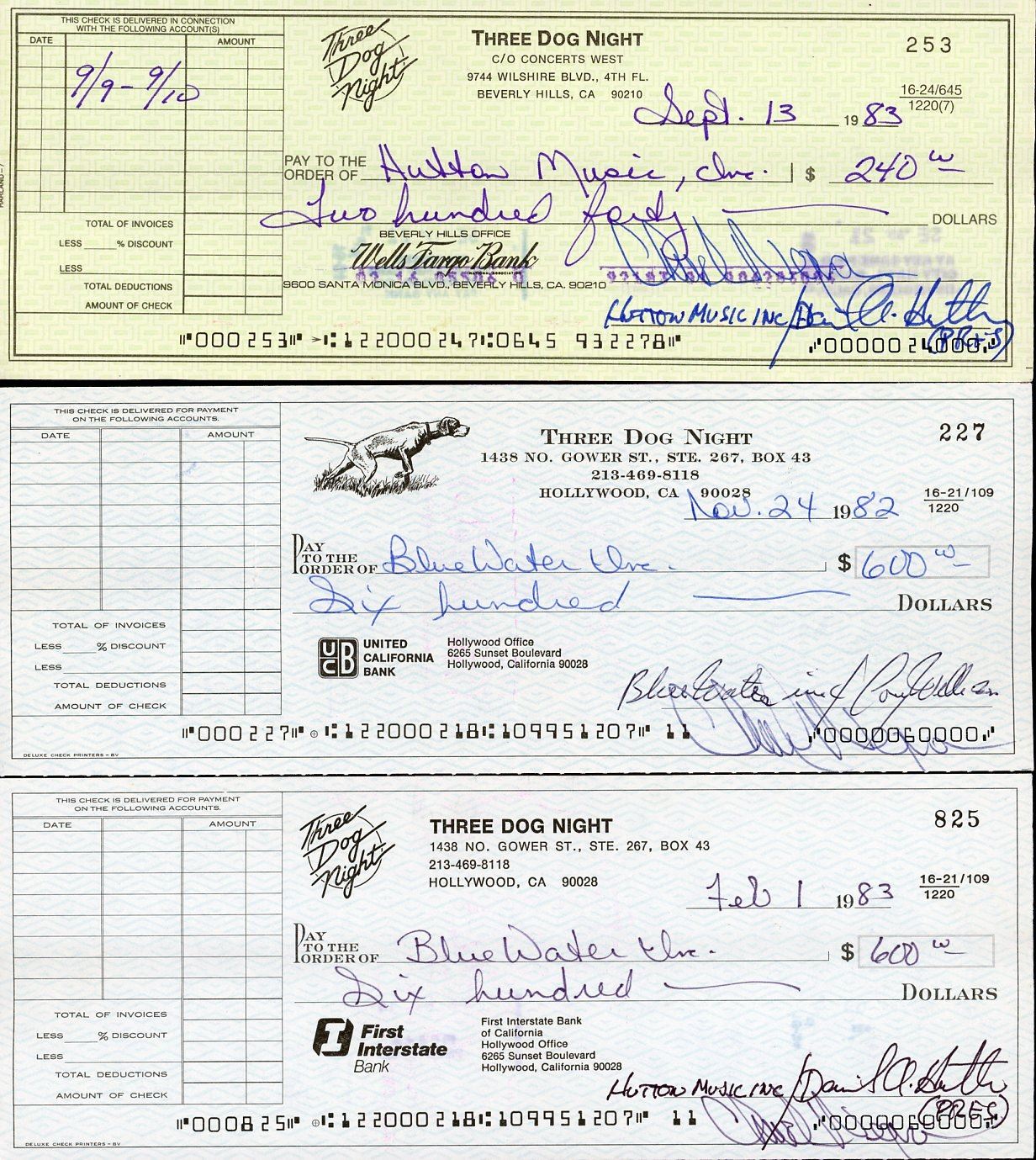 Set of three bank checks from the account of Three Dog Night all signed by Chuck Negron. All items come with a COA and guarantee for the life of the piece.
