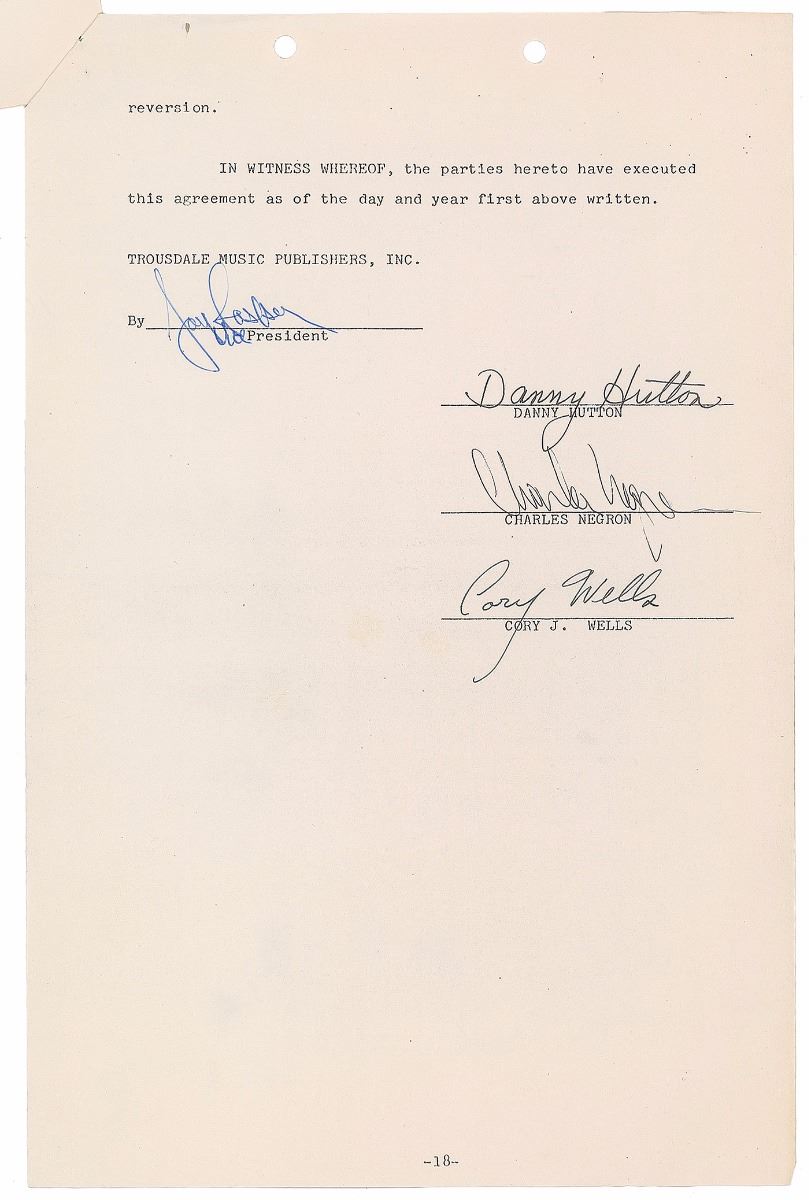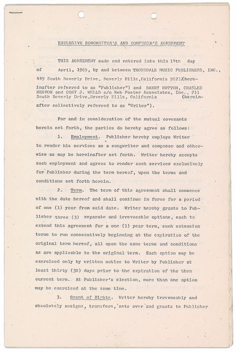 DS signed “Danny Hutton,” “Charles Negron,” and “Cory Wells,” eighteen pages, 8.5 x 13, April 14, 1969. Exclusive songwriter’s and composer’s agreement between Three Dog Night and Trousdale Music Publishers related to the publishing rights for their music made in the following year. In fine condition.