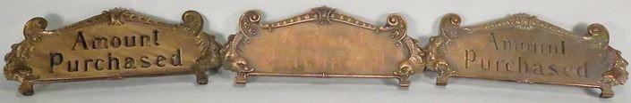 Three Dolphin Décor Cash Register Top Signs, "Amount Purchased". Two copper and antique bronze finishes. 8 1/8 inches between mounting holes.