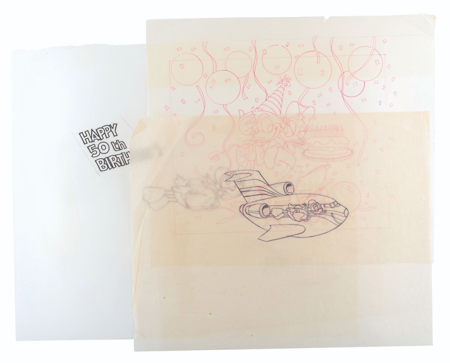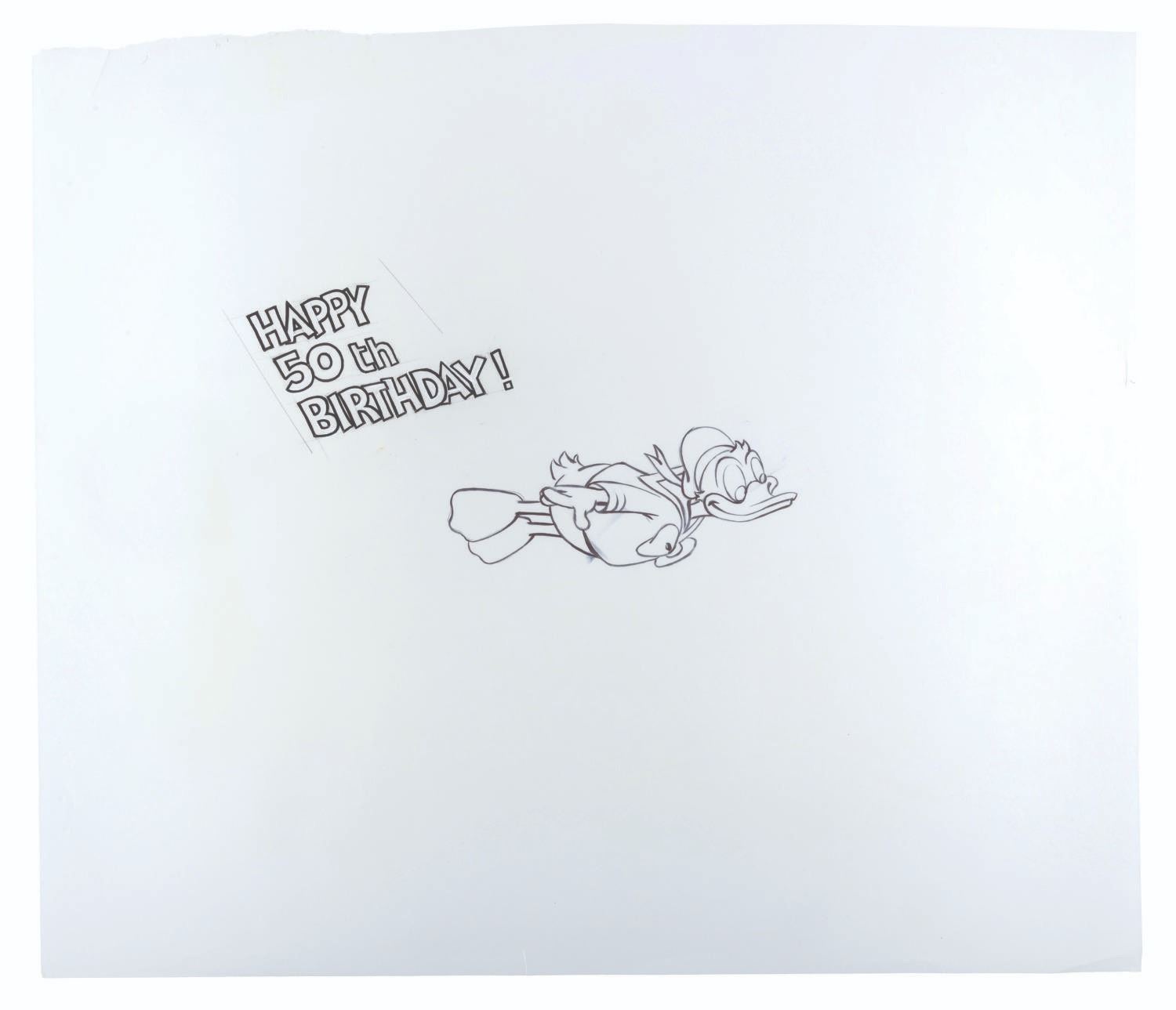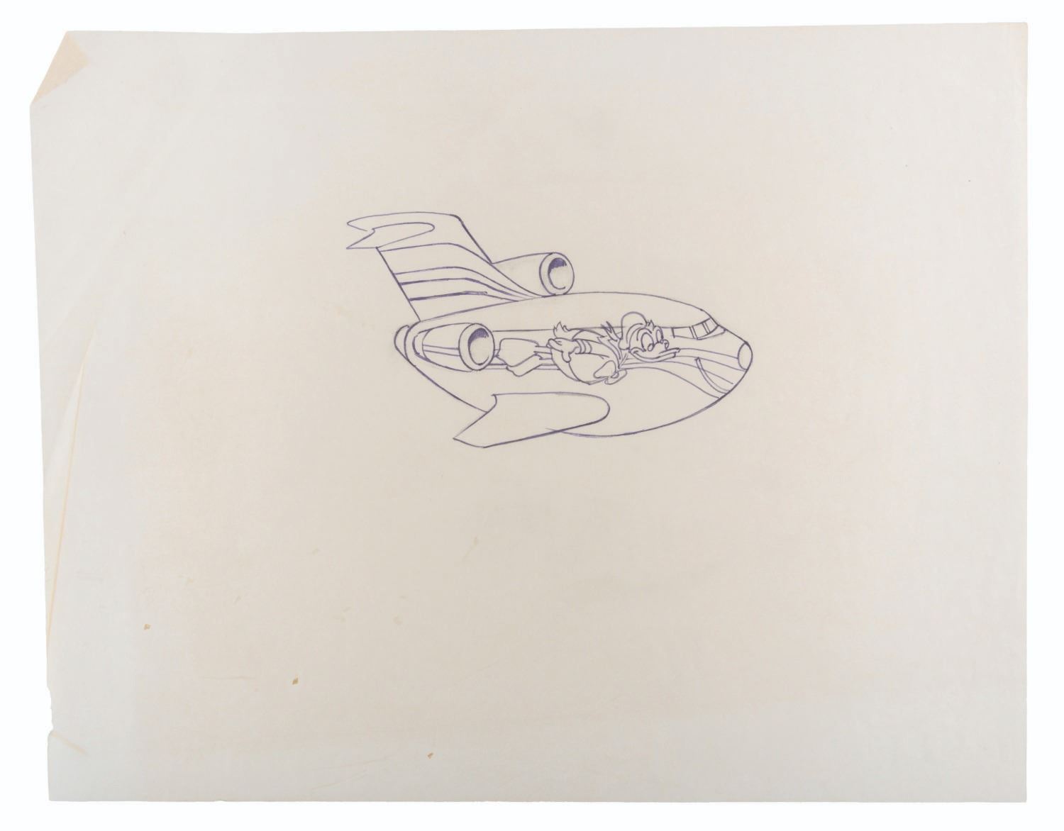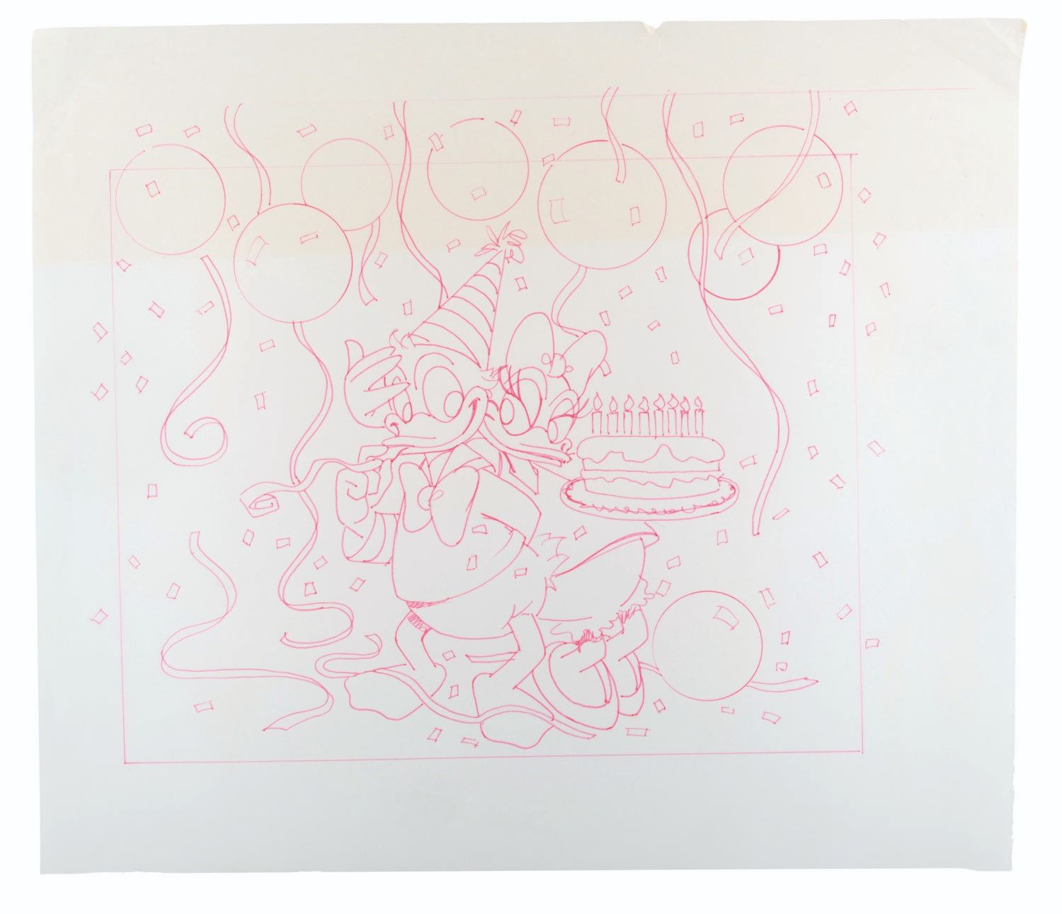 (Disneyland, 1984) Three drawings from the development of promotional materials and merchandise for Donald Duck’s 50th Birthday celebration at Disneyland. Accomplished in ink on vellum, two of the drawings were used for Donald Duck’s 50th Birthday tour vouchers, and the other includes Daisy Duck. Ranging from 11" x 14" to 14" x 16.25", the drawings are in good condition overall with some edge wear, including minor tears and creasing.