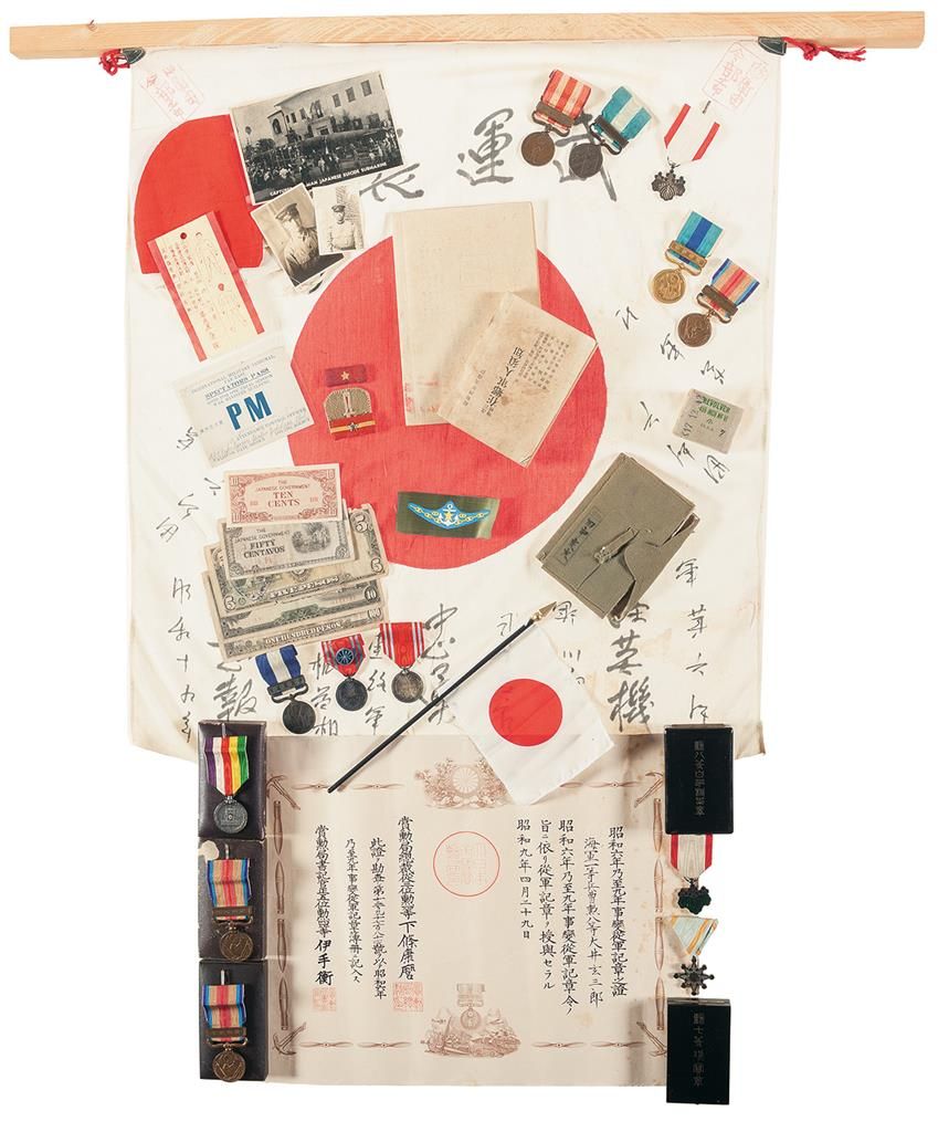 A) Manufactured from 1915-28 with a box of MK VI cartridges. Japanese military items: cased "Showa Enthronement 2600th National Anniversary" 1928, cased medal with award document, cased "Order of the Sacred Treasure 8th Class" Military Medal, cased "China War Incidence" Military Medal, 8 medals (Order of the Rising Sun 8th class [unmarked], Men's Member Japanese Red Cross, Life Member Japanese Red Cross, China War Incident 1931-1934, Russo Japanese War 1904-1905, Japanese Service Medal 1914-1920, Sino-Japanese medal 1894-1895, unknown Japanese medal), 2 Japanese Field Manuals, signed battle flag, paper Japanese government currency, patches, flag, with American post card of Japanese two man submarine and International Military Tribunal Far East spectators pass.