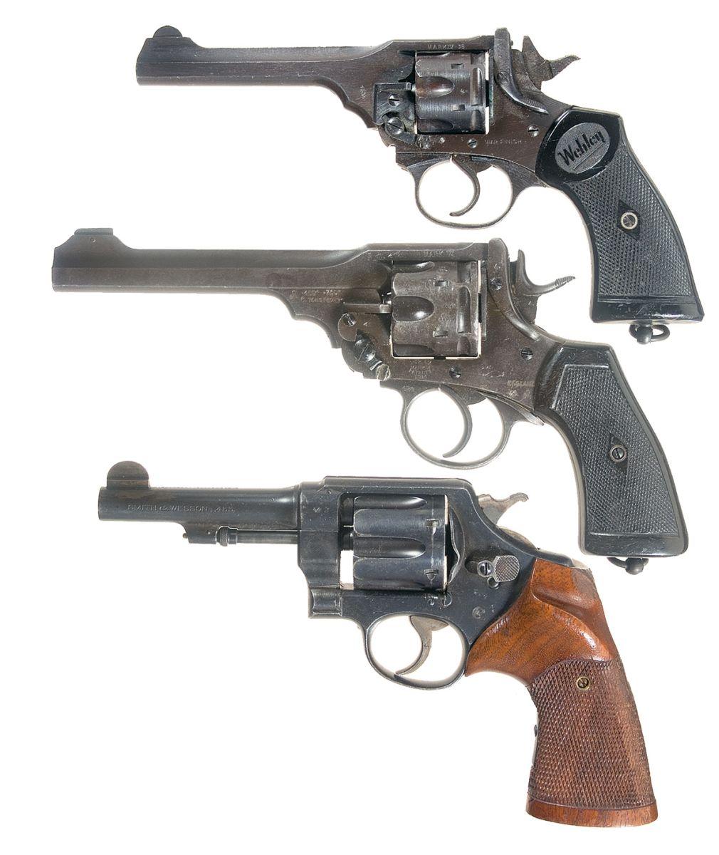 C) 2nd Model with shortened and sleeved barrel (consignor states caliber is now 45 long Colt, barrel retains original 455 caliber marking), Canadian "crossed pennant" and broad arrow proofs on frame. Replacement oversized checkered thumb rest grips (lanyard ring removed).