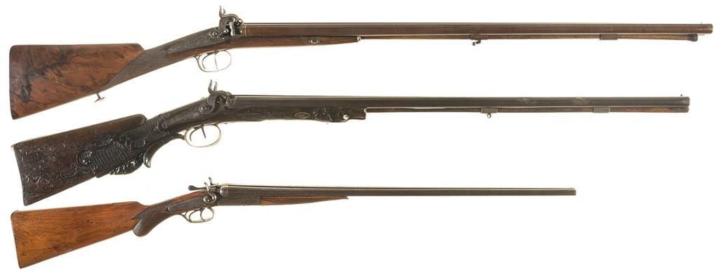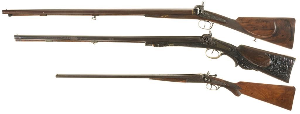 Three Double Barrel Shotguns -A) Engraved Delconmyn Kiobenhavn marked Percussion Shotgun