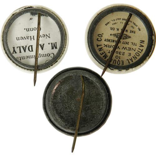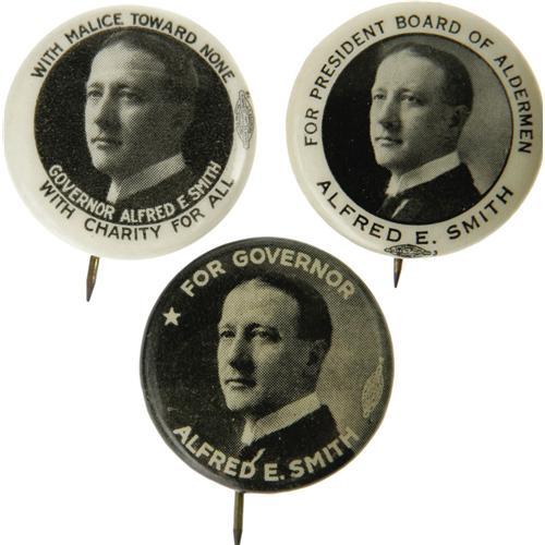 <B>Three Early Al Smith 7/8" Buttons, with Youthful Portraits.</B></I> Two New York Governor items, and one for President of the Board of Alderman. All three are in choice condition, and the two white-bordered vanities are quite scarce.
