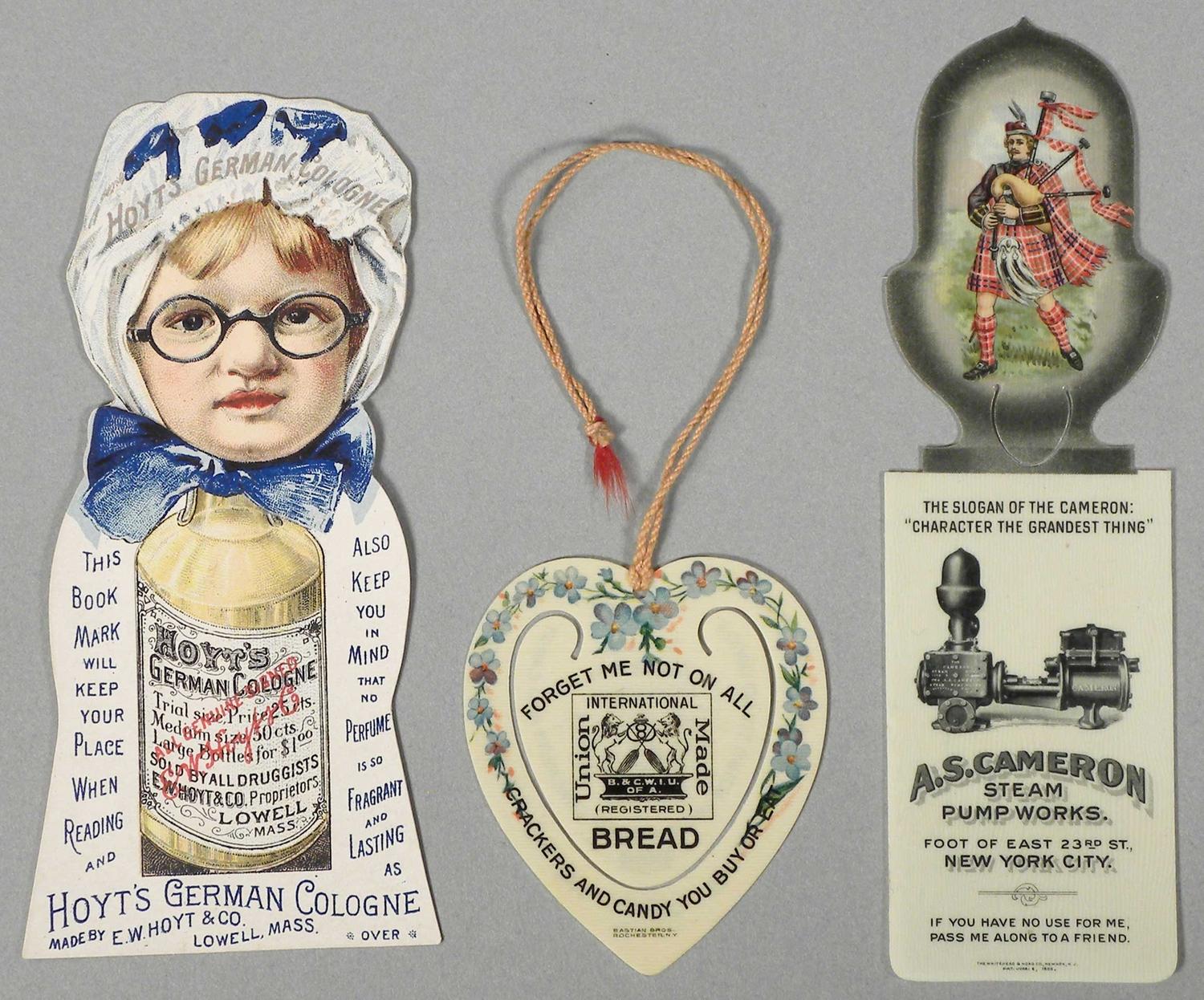 Lot of Three Book Marks including Cardboard Die Cut Hoyt's German Cologne, Lowell, Mass. Celluloid die cut Union Made Bread and Celluloid Die Cut A.S. Cameron Steam Pump Works, NY, NY. Depicting man playing bag pipes. All in near mint condition. Start Price $30