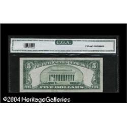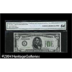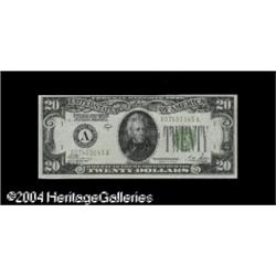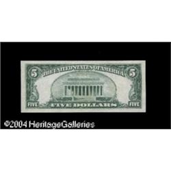 Three Early FRNs. RFr. 1950-F $5 1928 Federal Reser <B>Three Early FRNs.</B></I><BR>Fr. 1950-F $5 1928 Federal Reserve Note. Choice AU<BR>Fr. 1955-E $5 1934 Light Green Seal Federal Reserve Note. CGA Choice Uncirculated 64<BR>Fr. 2052-A $20 1928B Light Green Seal Federal Reserve Note. Choice AU.<BR>A faint fold is found on the non-CGA notes in this lot.<BR> 3 notes <BR><BR><B>Important notice:</B> Heritage usually auctions material at the rate of 200-250 lots per hour. On some occasions eBay Live bid software or the Internet may not be able to keep up with the pace of the auction. We recommend placing a realistic absentee bid now as insurance to avoid disappointment. Occasionally the auctioneer may eliminate or reject an eBay Live bid, and the auctioneer may also reopen a lot after the close of the eBay live bidding (usually because we missed an audience bid), and may reject your bid even if it shows you as the winning bidder. By bidding via eBay Live, you agree that Heritage may award the lot to another bidder at its sole discretion under the circumstances described above or any other reasonable circumstances. Since eBay bids are not shown to us until we open the lot on the floor, we treat those bids just like floor bids. In most cases the floor responds before the eBay bid is presented to us, due to Internet lag time, so for consistency we have made it a policy that floor bids are always considered first over tie eBay live bids. Also please note that all Heritage lots purchased through eBay Live carry a 20% Buyer's Premium. Please make sure you read the Terms and Conditions before you bid. This lot is being auctioned in conjunction with a live floor auction by Heritage Galleries & Auctioneers. All final auction and invoice information will be supplied by Heritage Galleries & Auctioneers, and all other information should be considered preliminary. Lot:16377