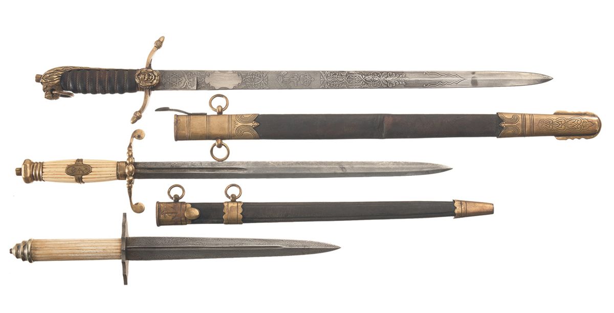 British Navy short sword, 18 1/2" etched blade with Dieu et mon droit coat of arms, "S" guard with acorns, lion head pommel, scabbard with brass fittings; navy dagger, 14 3/4" double edged blade, ivory handle with crown/anchor on brass fittings, sheath with brass fittings; dagger, 9 3/4" Damascus blade, ivory handle. Very good.