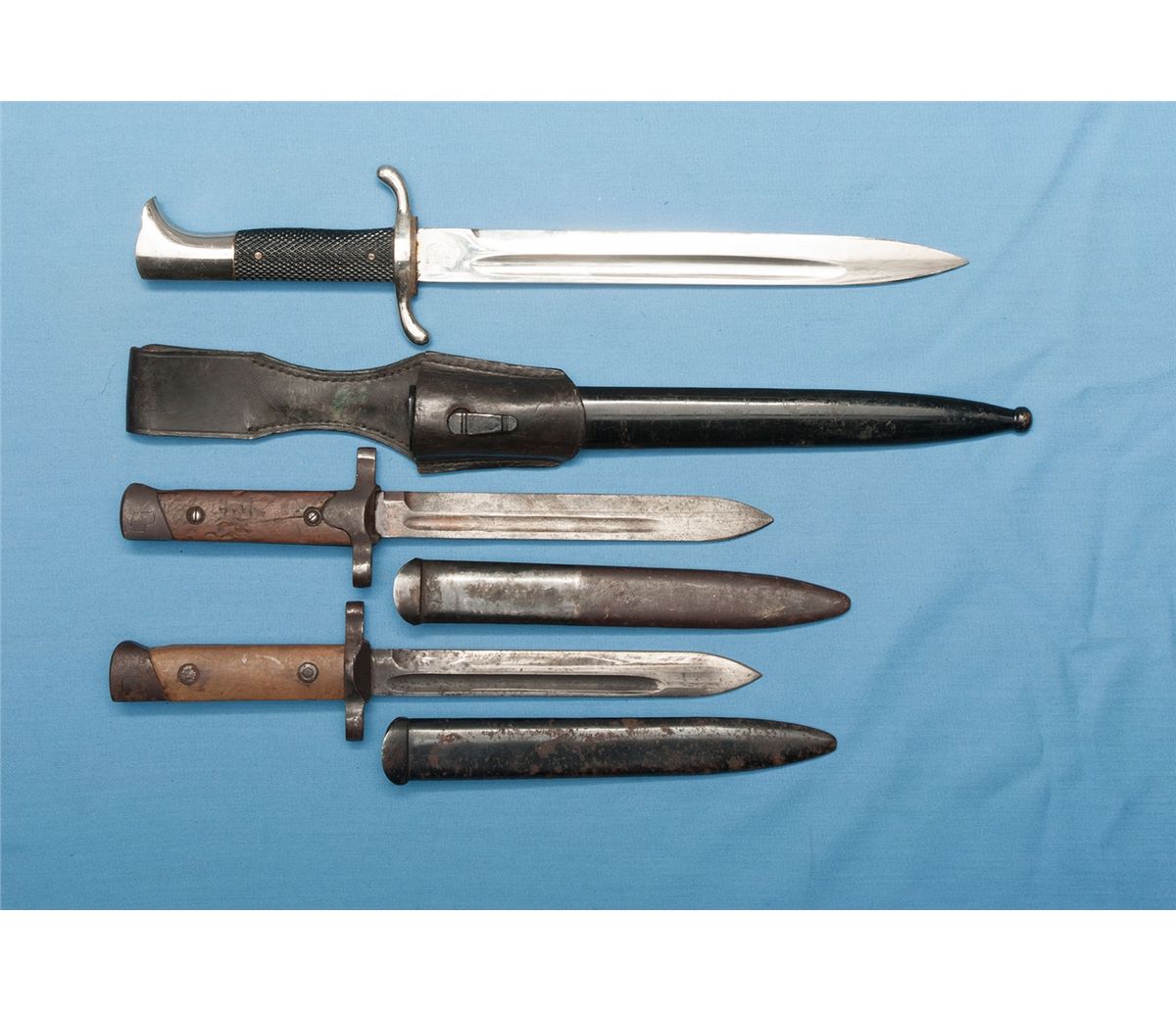 Carl Eickhorn WWII German dress bayonet with a 9 1/2 inch blade and metal scabbard. Two Italian Carcano bayonets with 7 inch blades and metal scabbards. CONDITION: Fair to good overall.