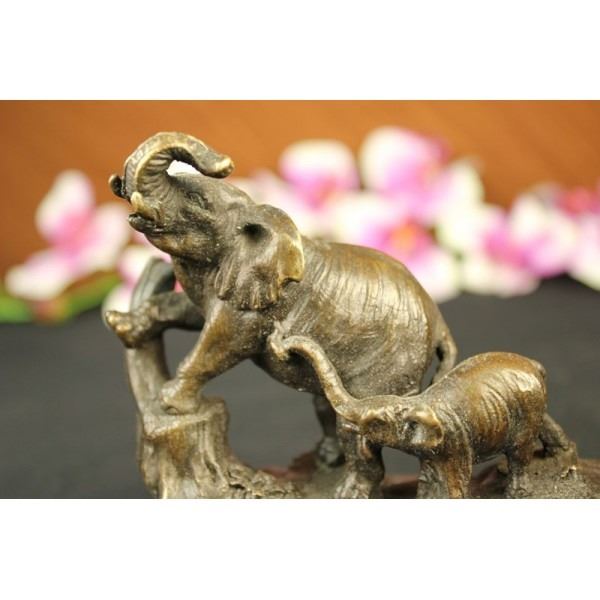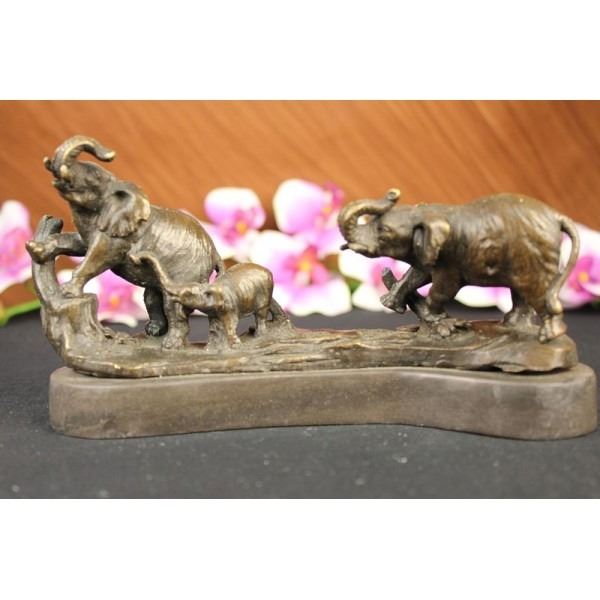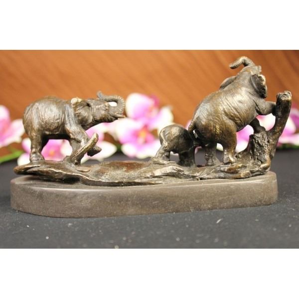 Some of the few members of an elephant clan can be imagined on the banks of a watering hole in the hot plains of Africa. Reaching the final destination after an epic migration they all trumpet their trunks into the air in reverie. For years the elephant has been known as a sacred animal in the East. As the largest animal to walk the Earth, the elephant is known as a symbol of strength and power. In Buddhist cultures, white elephants are symbolic of patience and wisdom. The Chinese see elephants as a symbol of energy, strength, and power. Ganesha is a Hindu deity with an elephant head. The bronze trio was captured using the ancient method of lost-wax casting and stained with a brown patina finish for preservation and mounted upon a marble base. Dimensions: Height 6 X Width 10 inches. Weight: 6 LBS.