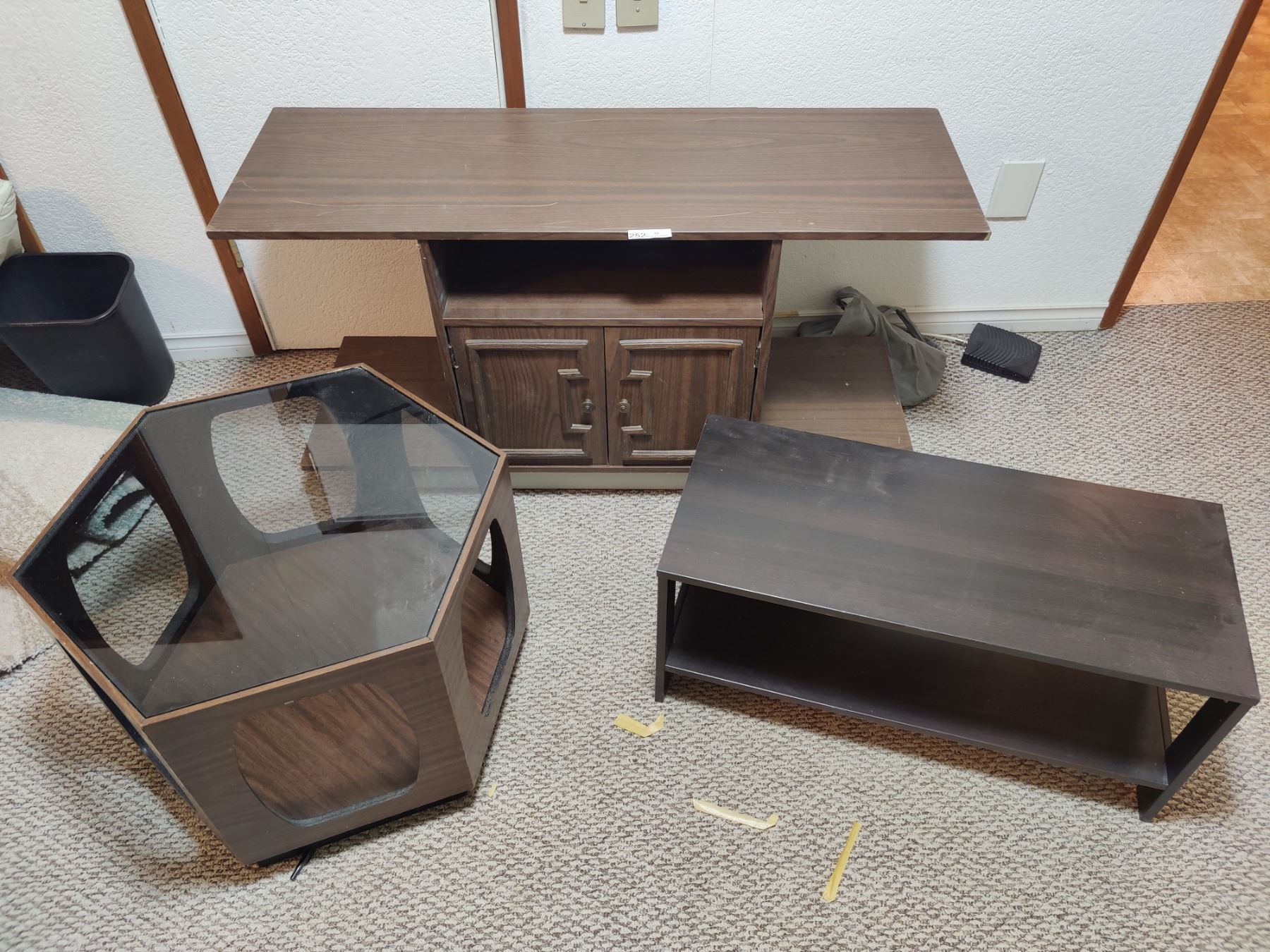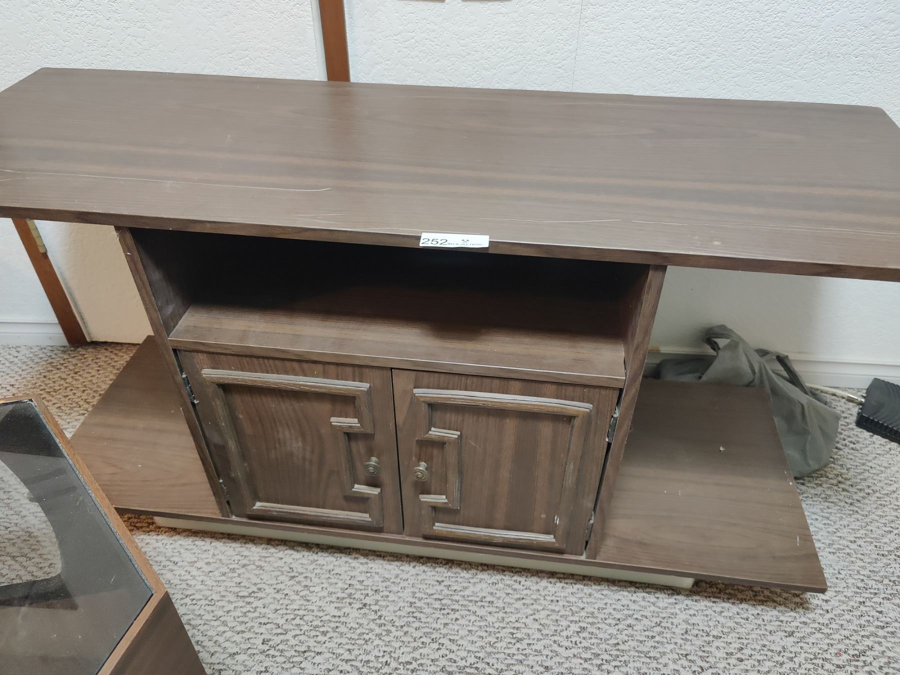 One large rectangular tv stand. Measurements:48" across, 16" deep and 26" high