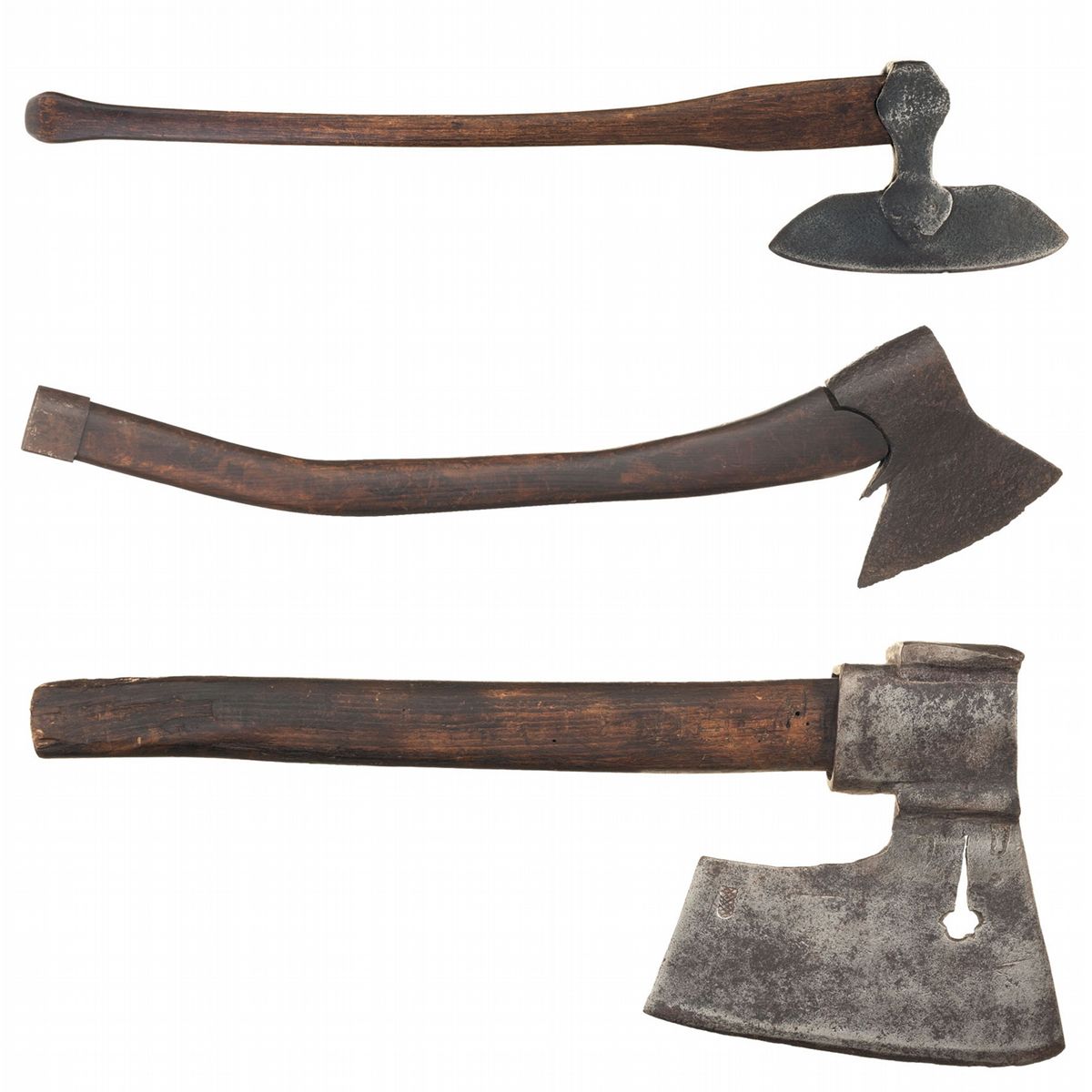 1) European broad axe, 39 1/2 inches overall, with an 11 1/4 inch wide, 3 inch long blade riveted to a steel head, with a 33 1/4 inch long shaft, flared at the top with a smooth oval grip and a knob pommel. 2) European broad axe, 28 1/2 inches overall, with a 6 inch long iron head, 6 1/2 inch long edge, and a curved shaft with metal cap. 3) Broad axe, 16 1/2 inches overall, with a 7 inch wide head and a 7 1/2 inch long edge, with a flat hammer head on the rear, a piercing in the blade, 3 maker/control stamps with 1 appearing to be a Swiss Solothurn control stamp, and the other 2 appear to be the outstretched head and neck of a bird. Has a smooth oval hardwood shaft. Provenance: The William Ashby Collection