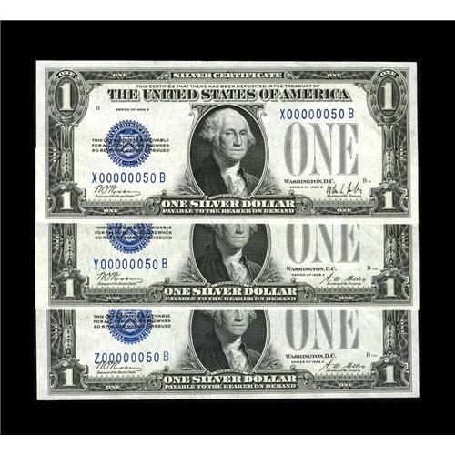 <B>Three Experimentals with Serial Number "50."</B></I><BR>Fr. 1601 $1 1928A Y-B Experimental Silver Certificate. <B>Choice CU</B></I><BR>Fr. 1601 $1 1928A Z-B Experimental Silver Certificate. <B>Choice CU</B></I><BR>Fr. 1602 $1 1928B X-B Experimental Silver Certificate. <B>Choice CU</B></I>.<BR>Full embossing and natural paper wave ride this trio.<BR><I>From The Bill and Kathy Stella Currency Collection</B></I><BR><BR><b>Shipping:</b> Coin/Currency (<a target="_blank" href="http://www.heritageauctions.com/common/shipping.php">view shipping information</a>)