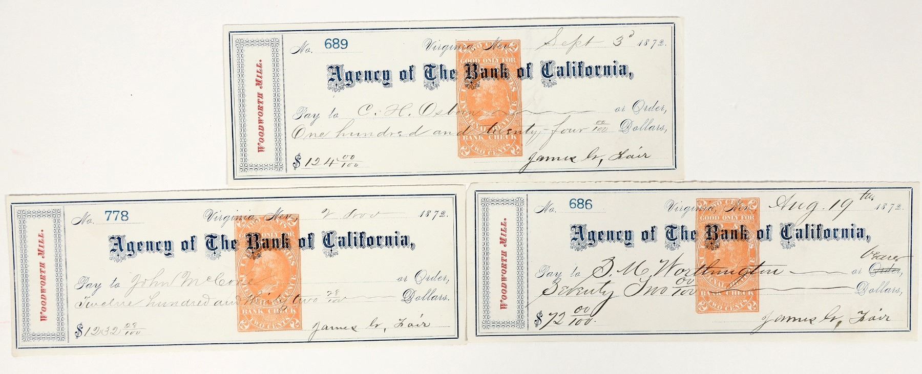 Lot of 3 crisp Woodworth Mill, Virginia City, Nevada checks signed by Bonanza King mining millionaire/ US Senator James G. Fair. RN-B. The Woodworth Mill, built in 1864, was located on the Carson River approx. one mile above Dayton. It was a 24-stamp mill with 12 pans and a 48-ton capacity. In 1871, "Bonanza Kings" James G. Fair and John W. Mackay of the Pacific Mill and Mining Company purchased the mill and began an overhaul under the supervision of S. Fountain. They installed a new turbine wheel of 240 horsepower along with a dozen new pans of the largest scale. In 1874, the mill started crushing 40 tons a day of Silver Hill Mine ore.
