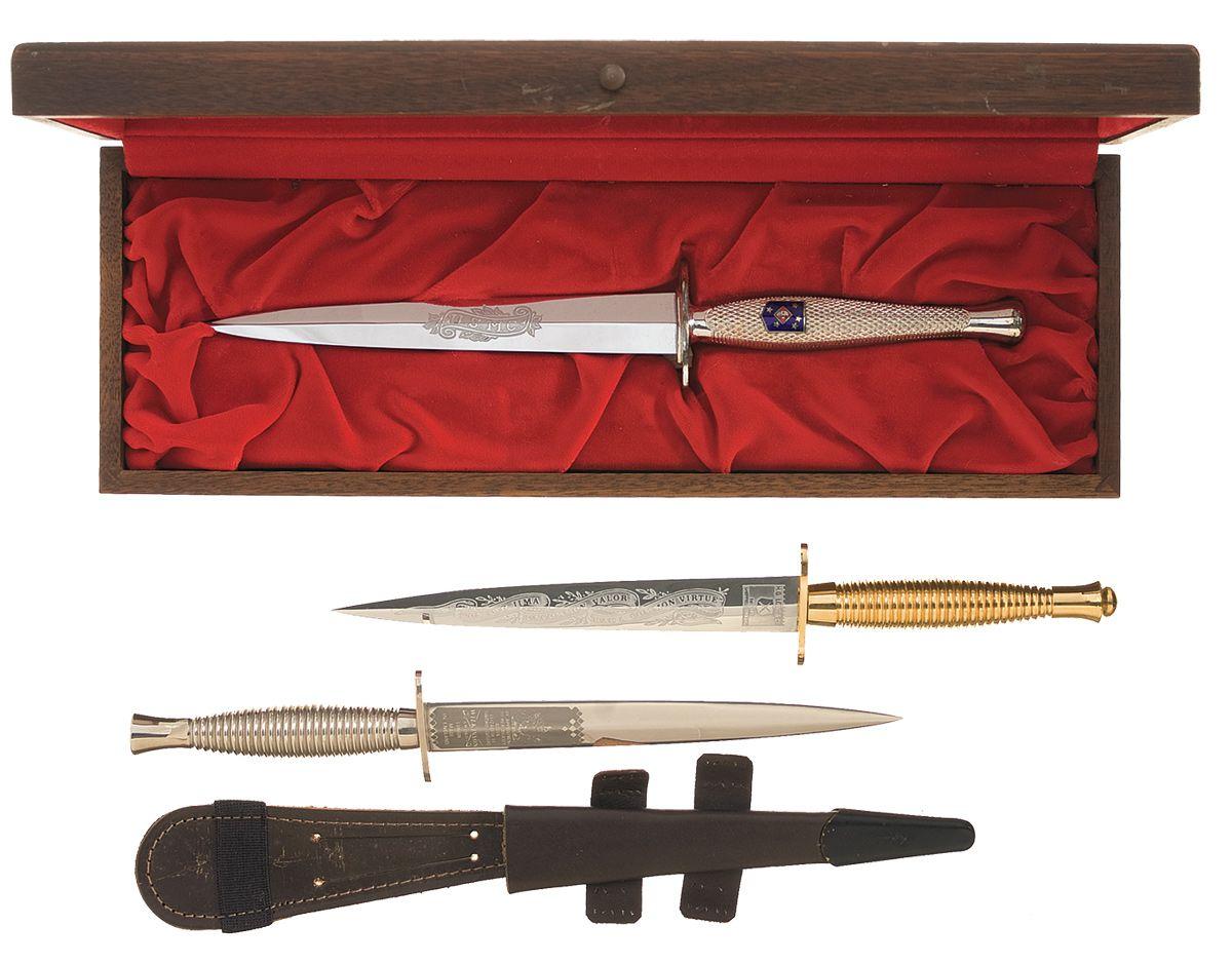 1) U.S.M.C. Raider commemorative dagger, 7" blade, etched "U.S.M.C." banner and H.G. Long (Sheffield) makers marks. Nickel finished grip and guard, with a Raider badge inset on one side. In wooden case. 2) H.G. Long Iwo Jima commemorative, 6 3/4" blade with etched designs, gold colored ribbed grip. 3) Wilkinson Sword Co (London) dagger, 7" blade, etched makers marks, nickel finished guard and ribbed grip, with a blackened brass tipped leather sheath.