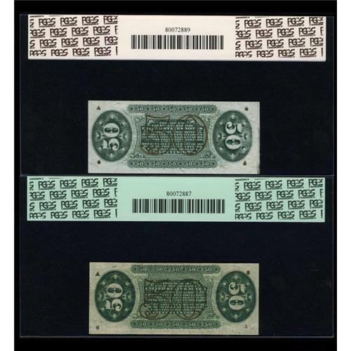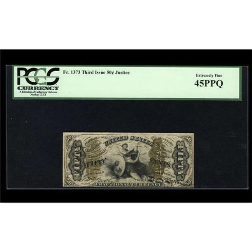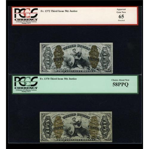 <B>Three Fiber Paper Justice Notes.</B></I> <B>Fr. 1370 50c PCGS</B></I> <B>58PPQ</B></I>, a lovely note, with broad margins, super color and clearly original paper surfaces. <B>Fr. 1372 50c PCGS Apparent 65</B></I>, an attractive note with extraordinary margins and the PCGS comment, "Bleached." <B>Fr. 1373 50c </B></I>a handsome <B>PCGS Extremely Fine 45PPQ</B></I>. <BR><I>From The Thomas M. Flynn Collection</B></I><BR><BR><b>Shipping:</b> Coins & Currency (<a target="_blank" href="http://www.heritageauctions.com/common/shipping.php">view shipping information</a>)