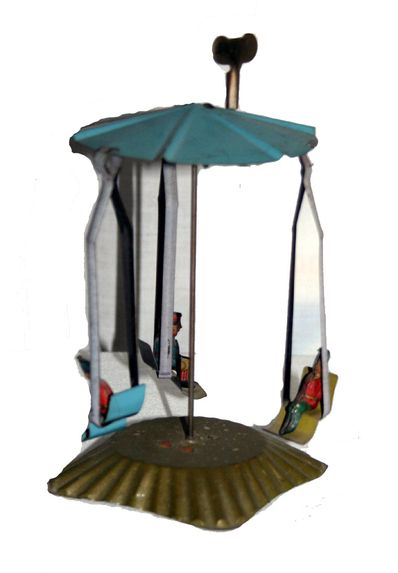 Very early tin toy. Three figures on swing reminiscent of a carnival ride. Key wind mechanism on top. Working condition.