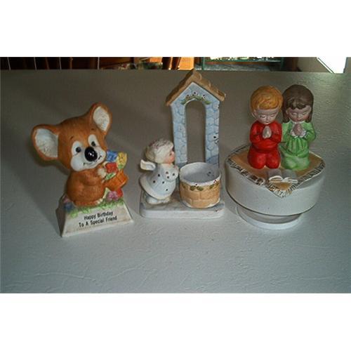 <table width="100%" border="0" cellspacing="0" cellpadding="4"><tr><td><em> VERY LOW RESERVE. REDUCING INVENTORY!</em></td></tr><tr> <td width="100%"> Displaying three (3) separate figurines. One features a 1979 RUSS BERRIE & CO., Inc. figurine of a colorful animal carring a basket of flowers. Bottom front states: Happy Birthday To a Special Friend. Measures 5 inches tall; base measures 3 inches long by 2 inches wide. The second figurine displays an angel kneeling at a wishing well. Applied wings decorated with red holly berries and green leaves. This figurine is embossed on the bottom: c. 1983-W.A.-R.O.C.-Made In Tiawan. Measures: 6 inches tall; base measures 3 3/4 inches long by 3 inches wide. The third figurine dislays a brown haired little girl dressed in green and white, along with a little boy with auburn hair, dressed in red. Both have folded hands and are praying. Also a music box that plays: Jesus Loves Me. Bottom states: M.W. Co. Dated 1980. Three wonderful figurines. </td></tr><tr> <td> </td></tr><tr> <td>Reference #: 636B</td></tr><tr><td>Condition:Mint</td></tr><tr><td>Year:1970-1980-1983</td></tr><tr><td>Title:Three Figurines-Two Marked</td></tr><tr><td>Location:Letart, West Virginia</td></tr></table>