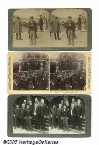 <B>Three Fine Stereoviews of Famous Black American Booker T. Washington</B></I> Born a slave, Booker T. Washington attended school after the Civil War. In 1881, he started the Tuskegee Institute in a shanty and an old church. He was later an advisor to President Theodore Roosevelt. The first card shows Washington on the steps of the Tuskegee Institute with a group of philanthropists and educators, including Andrew Carnegie and Charles Eliot, President of Harvard, with printed legend at the bottom. The second depicts Washington, again at Tuskegee, with President William McKinley and Governor Joseph Johnston, photographer's imprint at bottom. The last frames Washington on the street with his hand in his coat, photographer's imprint at bottom. Three scarce African American items. Lot:250