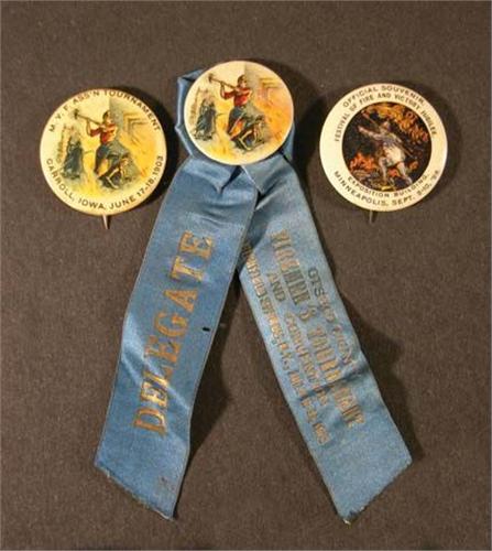 Three firefighting celluloid pins with ribbons 1) Festival fire & victory jubilee Minneapolis 1898, 1.75", 2) MVF Assoc. Tour Carrol, Iowa, June 17 & 18, 1903, 1.75" 3)Celluloid button with ribbon for Otsego Co. fireman tour, 1.5" Richfield Springs, NY July 15 & 16, 1903.
