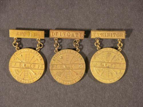 Three fire fighting medals, 6th Annual Convention FAS of PA. Harrisburg, 1885, extension pins, 2" long. 1) H.B.G.U. 2) Delegate 3) Exhibitor.