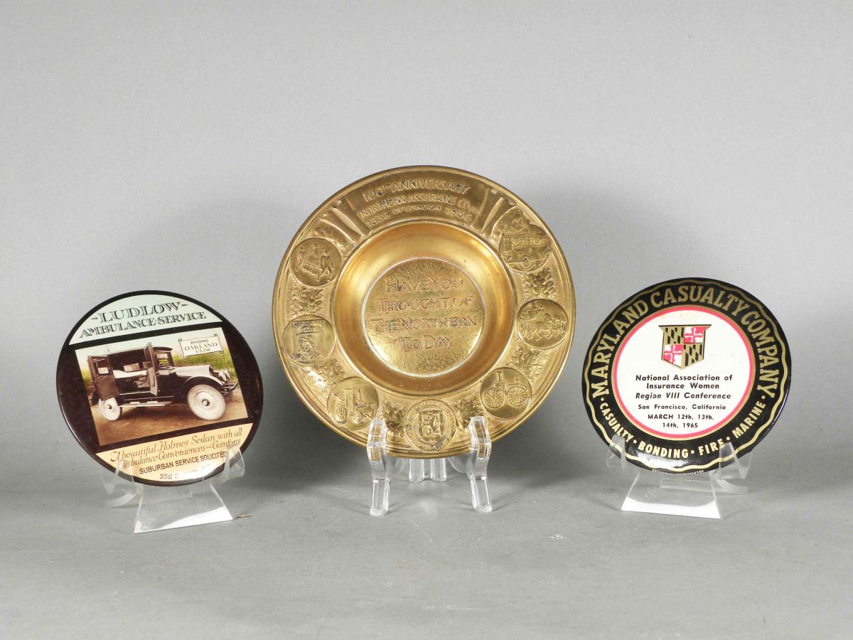 Lot of Three Fire Related Items including Ludlow Ambulance Service Paperweight Mirror, Maryland Casualty Company-San Francisco Paperweight Mirror and 100th Anniversary Commemorative Ashtray for the Northern Assurance Co. Ltd. Good to Very good condition.