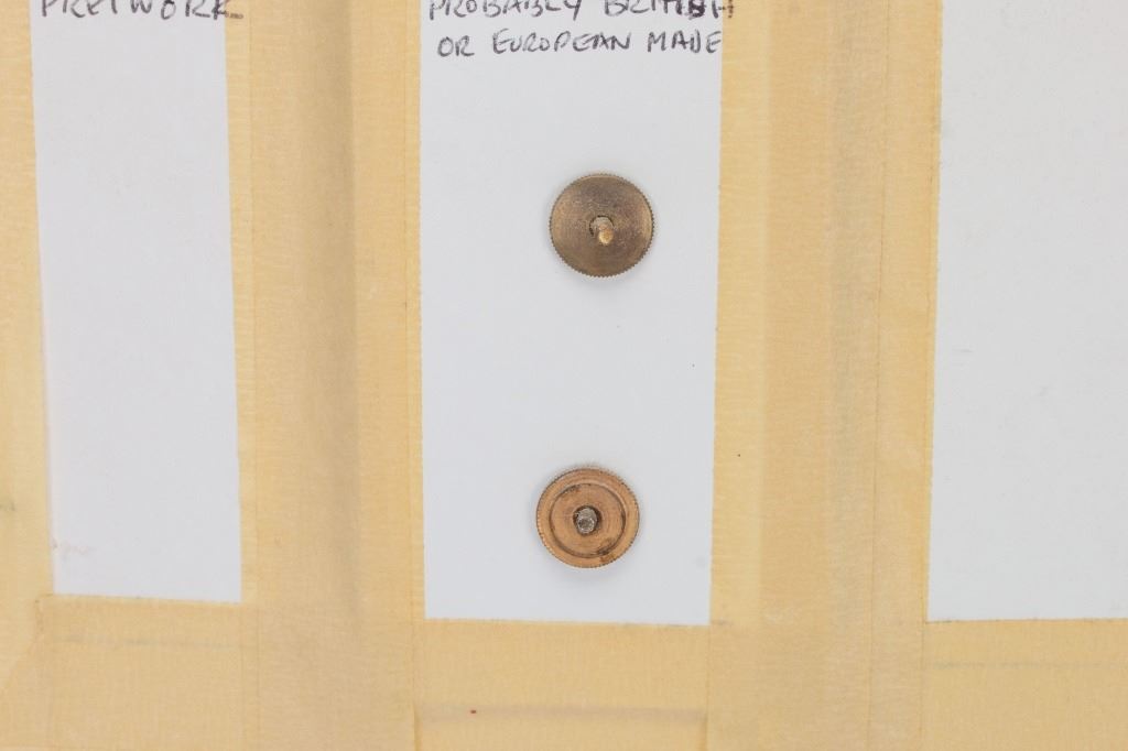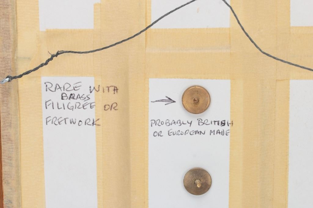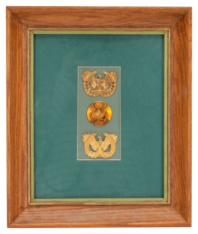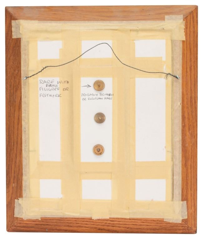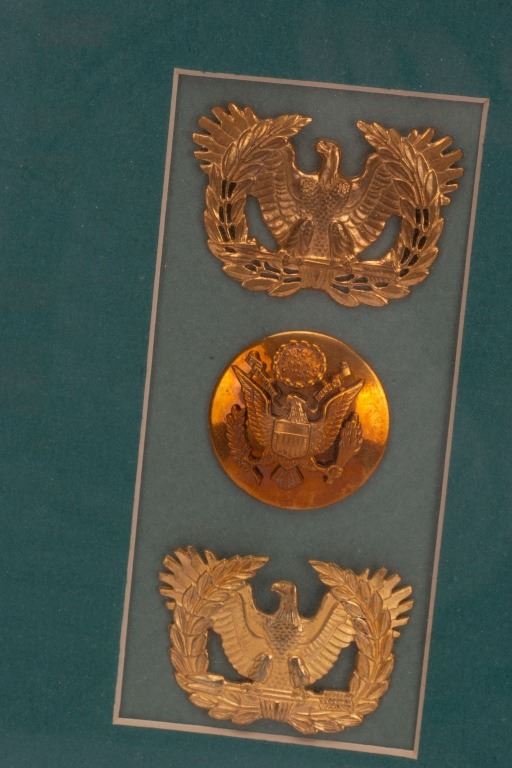 Item/Description: Framed United States Army WW2 cap badges include two "Eagle Rising" warrant officer cap badges and one US Army enlisted cap badge. Framed and mounted with pin backings visible on reverse side. Handwriting on frame back. Rare with brass filigree or fretwork. Probably British or European made. (Flight Officer Device, World War Two, Military)