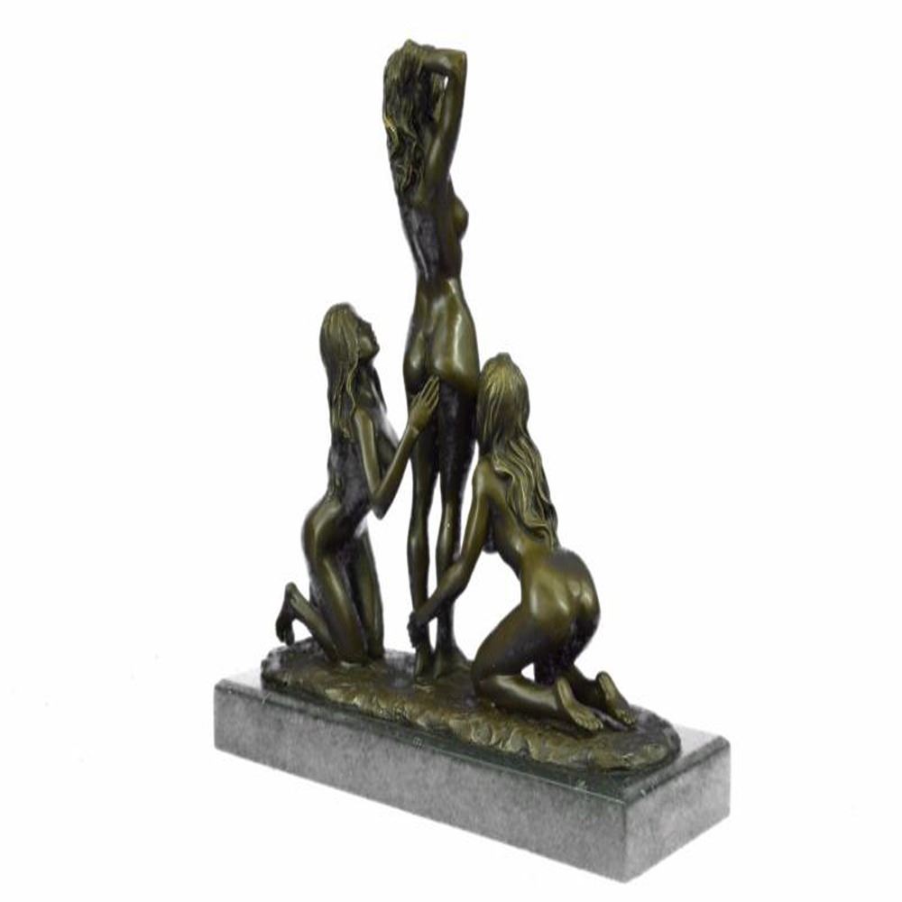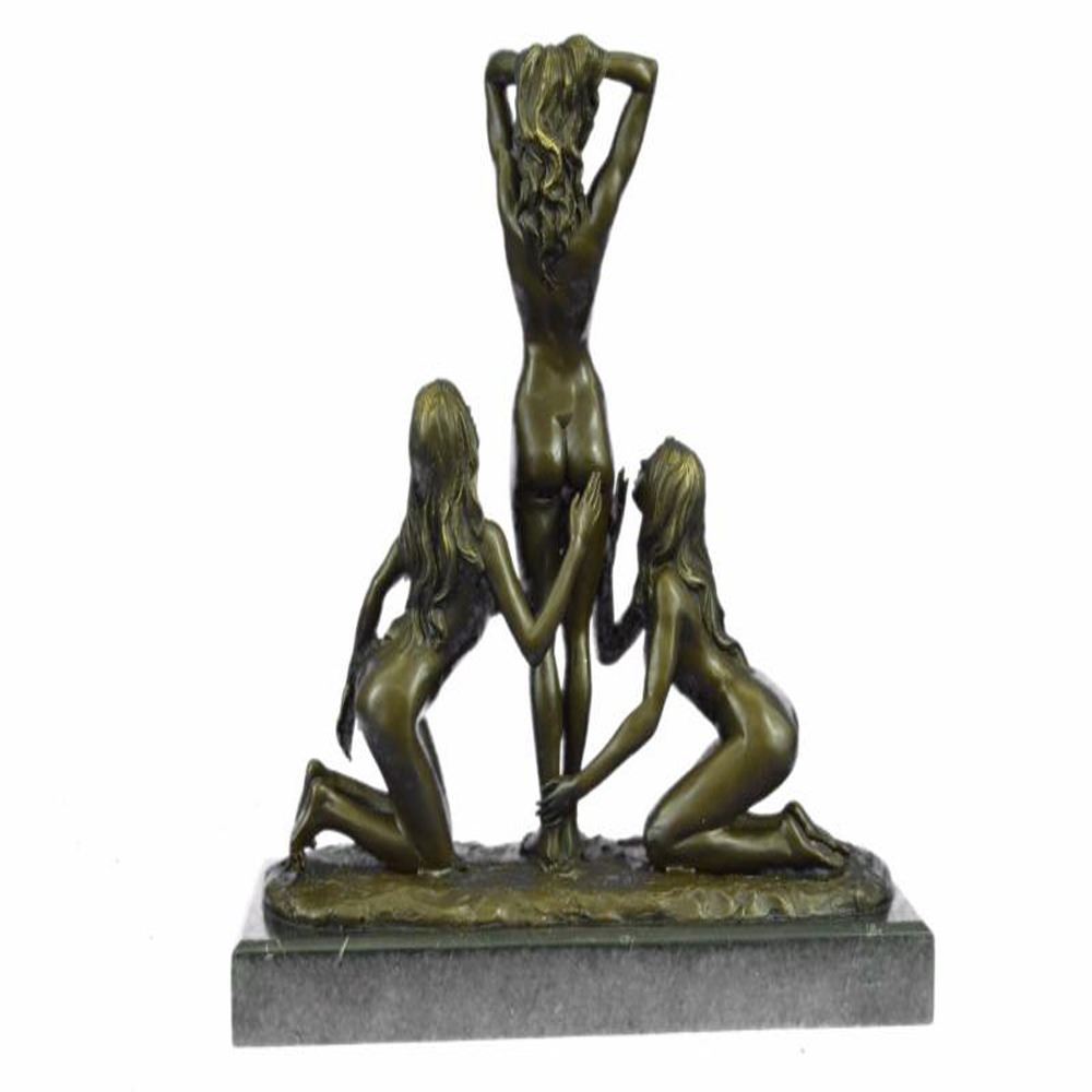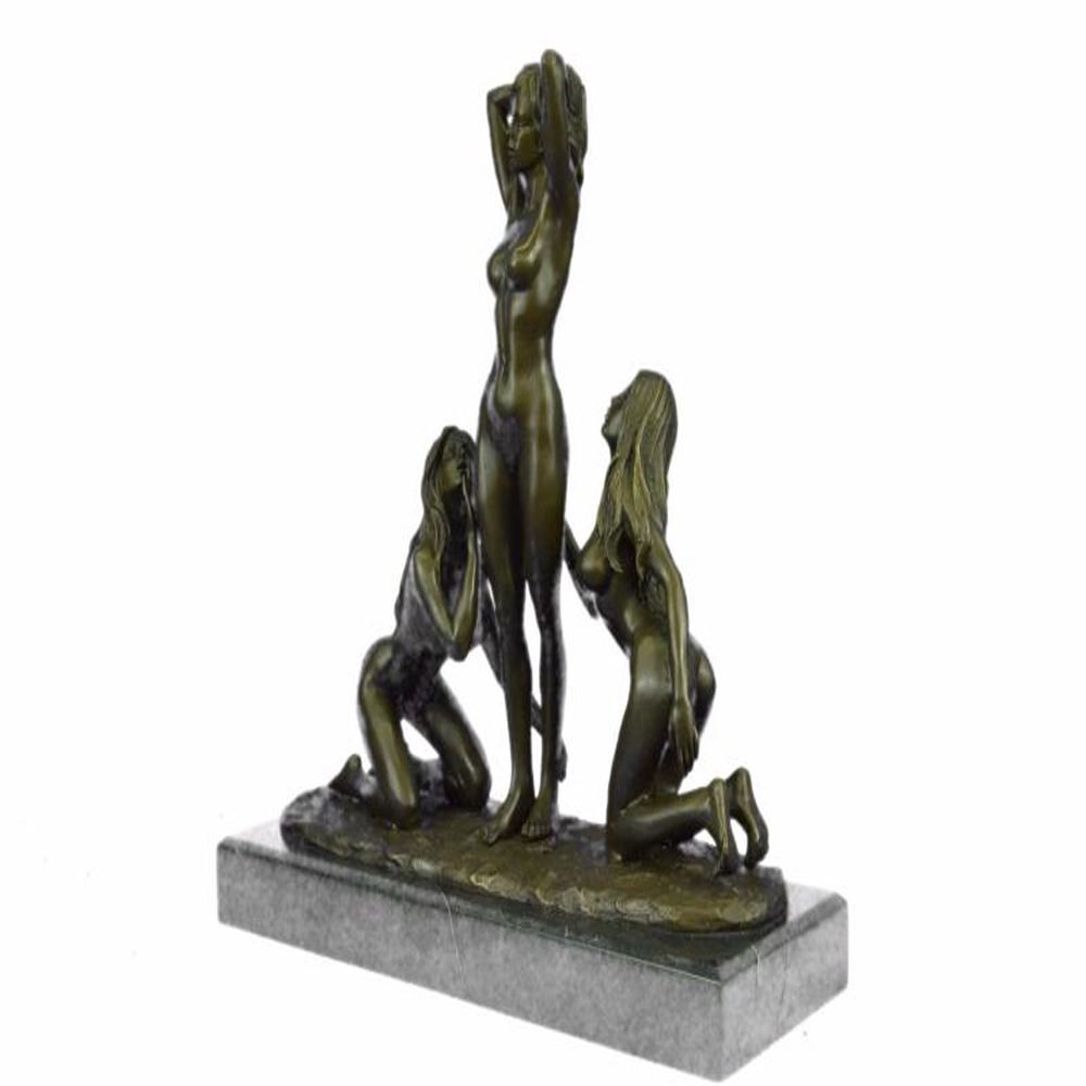 The three nude women Bronze Sculpture on base was cast by the traditional, Lost Wax Casting method of Bronze. This labor intensive and time consuming method of casting Bronze Statues, ensure pristine quality and vivid detail. We Offers a large selection of Bronze Statues and Bronze decoration perfect for indoor and outdoor use. This Artistic Would Embody The Feel Of A Womans Figure In Any Room. Bronze Dimensions with Marble Base: Height 12 Width 13 inches. Weight: 15 LBS.