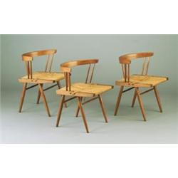 Three GEORGE NAKASHIMA grass-seated side chairs with rounded back and three pair of spindled supports on dowel legs. Unmarked. 27 1/4" x 23 3/4" x 18" $1,500 - 2,000