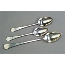 Each Old English pattern, 1803; the first two a pair of tablespoons, John Langlands, Jr., Newcastle with engraved griffin crest; the third a serving spoon, probably William Sumner, London, with engraved monogram and date 1798. Each marked.
