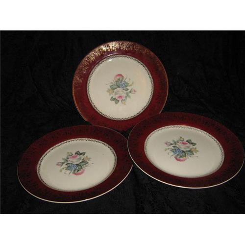 These four floral center,gold filgree maroon rim plates are 23 karat gold. They were made by georgian china.there 10 1/8" across, one is perfect two has small chips.Made in the USA, thanks for looking.