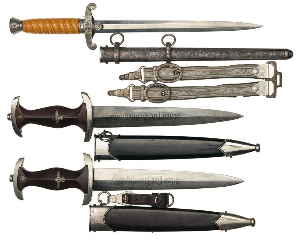 1) Tiger (Solingen) Luftwaffe-Style Dagger, 14 3/4" OAL, 9 3/4" blade, orange celluloid grip, scabbard with hanger. 2) Gottlieb Hammesfahr & Co (Solingen) RZM Marked NSKK Pattern Dagger, 13 3/4" OAL, 8 3/4" blade with "M7/67/41" RZM mark, wood grip, black-finished scabbard. 3) C.D. Schaff (Solingen) RZM Marked SA Pattern Dagger, 13 5/8" OAL, 8 3/4" blade with "M7/56" RZM mark, "Th" guard, and metal scabbard with hanger. Good overall.