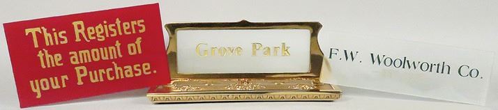 Three Reproduction Glass Cash Register Top Sign Inserts, one with brass frame. F. W. Woolworth, This registers the amount of your purchase and Grove park