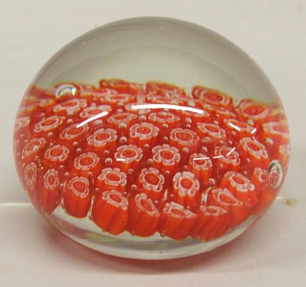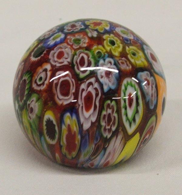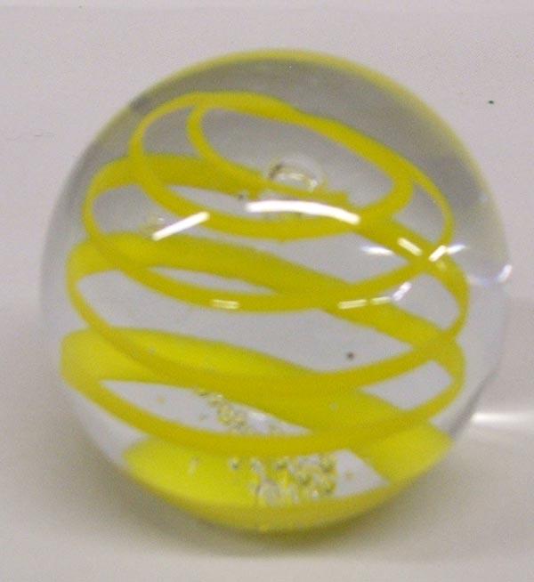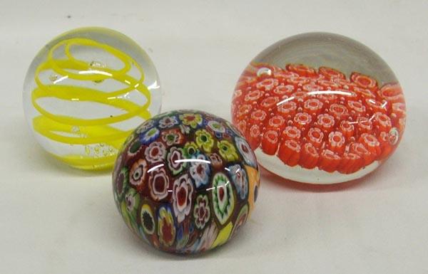Three Glass Paperweights includes Murano with old label-Italy, Milleflorie, and Yellow ribbon capturing a blown bubble, largest measures approx. 2.5'' x 3.25''. SHI $25.