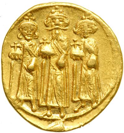 Three Gold Solidi. Group includes one minted under Phocas, one of Heraclius (obverse: three standing figures), and Constans II (two/two figure type). Condition averages Choice Very Fine. Lot of 3 coins.