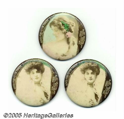 <B>Three "Good For 10 Cents In Trade" Advertising Pocket Mirrors</B></I> These are a rare and tough area of collecting. Many are unaware that this field exists and probably has a stronger following than the trade tokens. Here we present three very nice examples, two with the same design and the third different. All three advertise "Good For 10 Cents In Trade" at the Hotel Raymond in Fitchburg, Massachusetts. The pretty ladies in all three have a Victorian look only with their necklines considerably lower than what was acceptable at the time. Of the two of the same design, both are in good condition with one presenting as excellent. The third and more unusual graphic has a light fox on the cheek of the woman and a very faint background stain. All three show signs of silvering loss on the mirror side. A very respectable lot. All three were made by the Culver Novelty Company which made only a few pocket mirrors. Lot:253