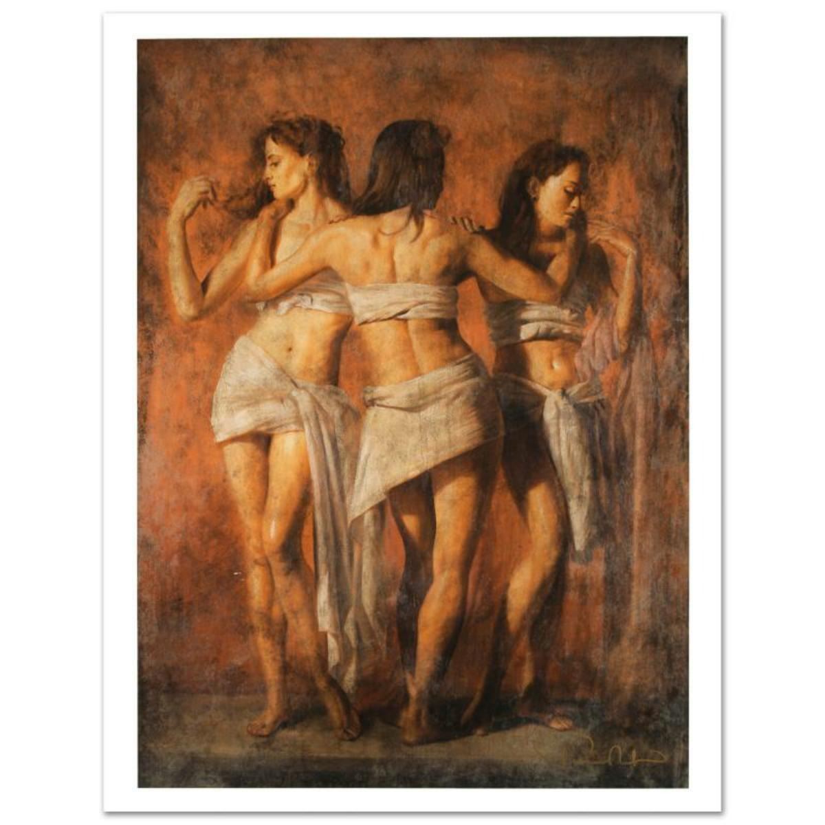 With a style that is reminiscent of the frescoes of Michelangelo and Caravaggio, Tomasz Rut creates breathtaking works of art that capture the beauty of the human form. "Three Graces" is a limited edition giclee on canvas, numbered 72 out of 95 and hand signed by Rut. Includes Certificate of Authenticity! Measure approx. 24.5" x 33.5" (image). Reference #: 199941