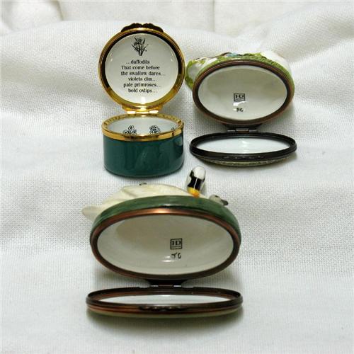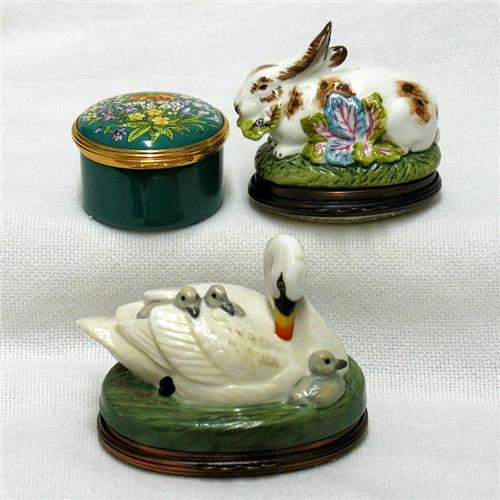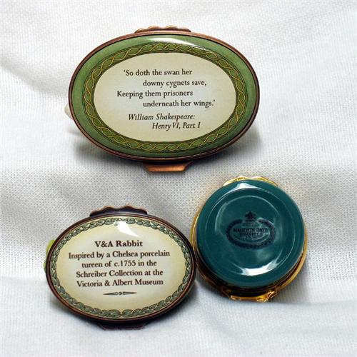 Three Halycon Days Enamels boxes including William Shakespeare "The Winter's Tale" 1" high x 1 3/4" diameter; Swan with cygnets 2 1/4" high x 3" x 2"; and V & A rabbit 2 1/4" high x 2 1/4" x 1 1/2"; no visible defects
