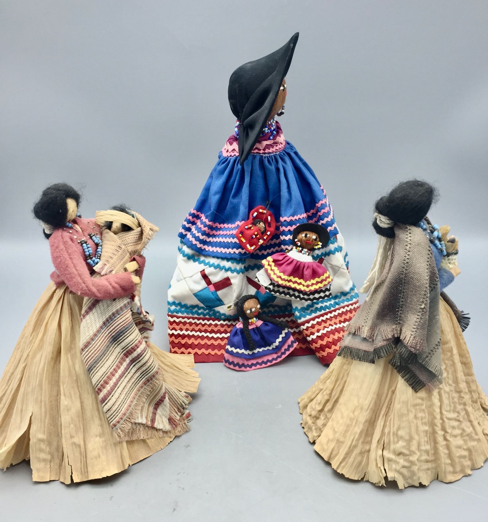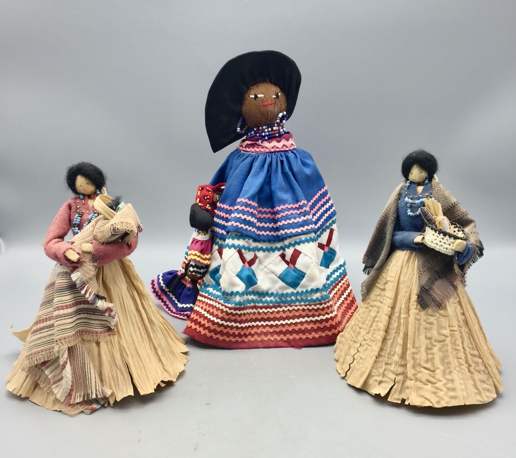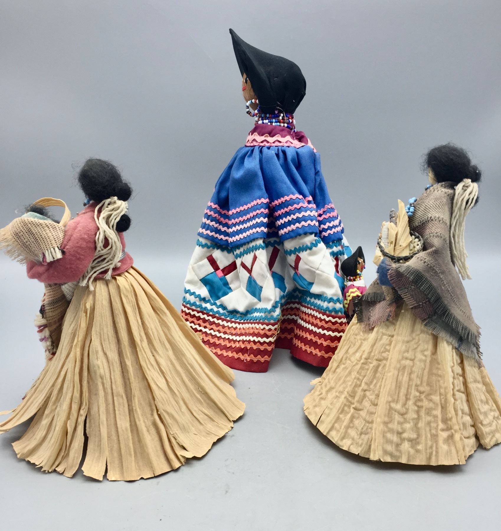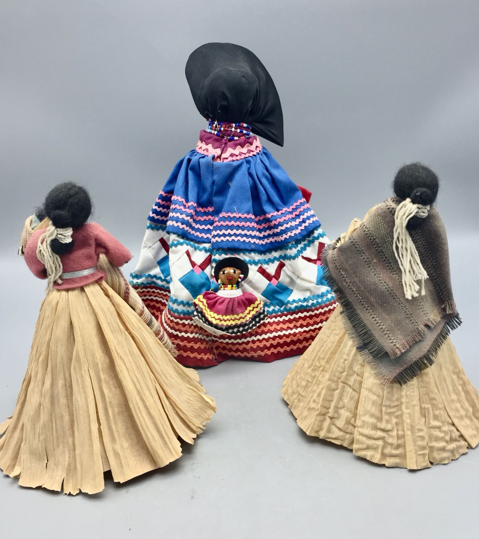 Description: For sale in this lot are three beautiful handmade dolls. There are 2 old corn husk dolls and a Seminole doll. All are handcrafted with great detail. Maker: Various. Approx. Age: Vintage. Size: 8.5” to 12” tall. Condition: Good for their ages, normal wear expected. Please look closely at the pictures - they are an important part of our description. Shipping: There will be a $12 handling, packaging fee for shipping this lot. The actual cost of postage will be added on top of that.