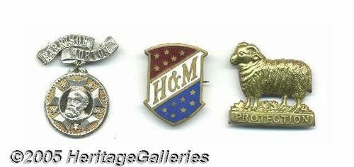 <B>Three Handsome Benjamin Harrison 1888 Campaign Items</B></I> This fine lot includes: Sullivan-DeWitt BH 1888-51 (a 25 mm silvered brass bust of Harrison within a maltese cross, against a gilt background, suspended from a "Harrison Morton" hanger lacking pin), a 23 mm x 32 mm red, white and blue enameled badge inscribed, "H & M" against a starry background, and a 32 mm x 32 mm gilt brass shell pinback in the shape of a ram inscribed, "Protection." These are quite showy and representative of 1880s campaign memorabilia. Lot:260