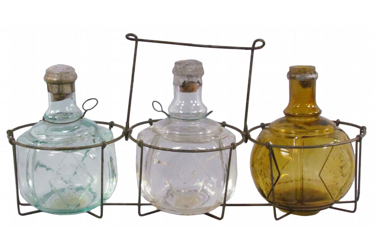 Three Hayward's Hand Grenades in wire rack. Green and clear are full, amber is empty. No chips or cracks, each measures 6 1/2 inches tall.
