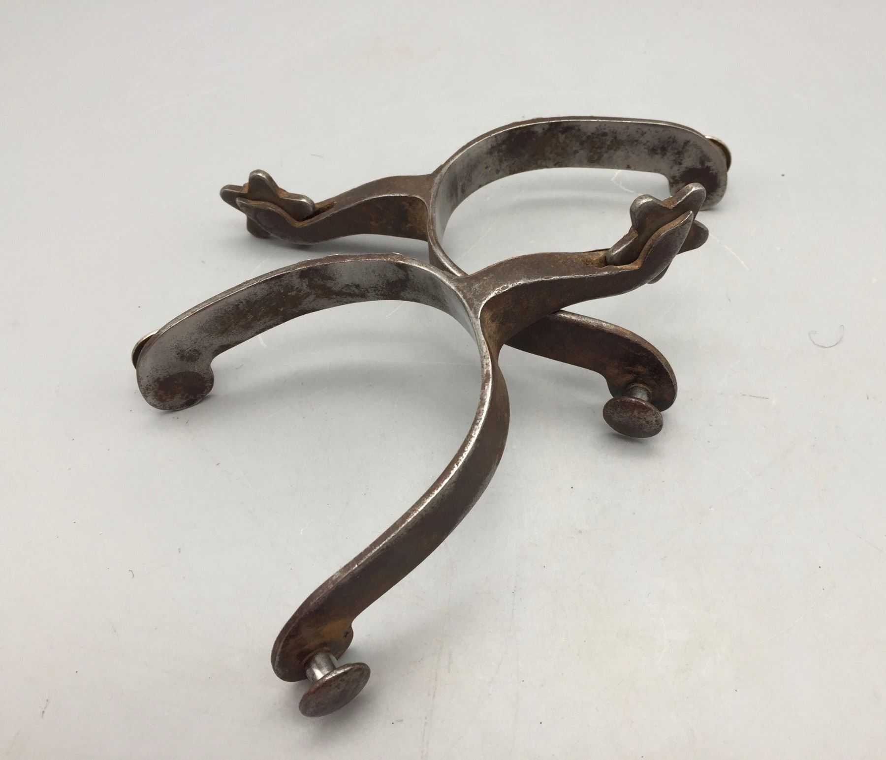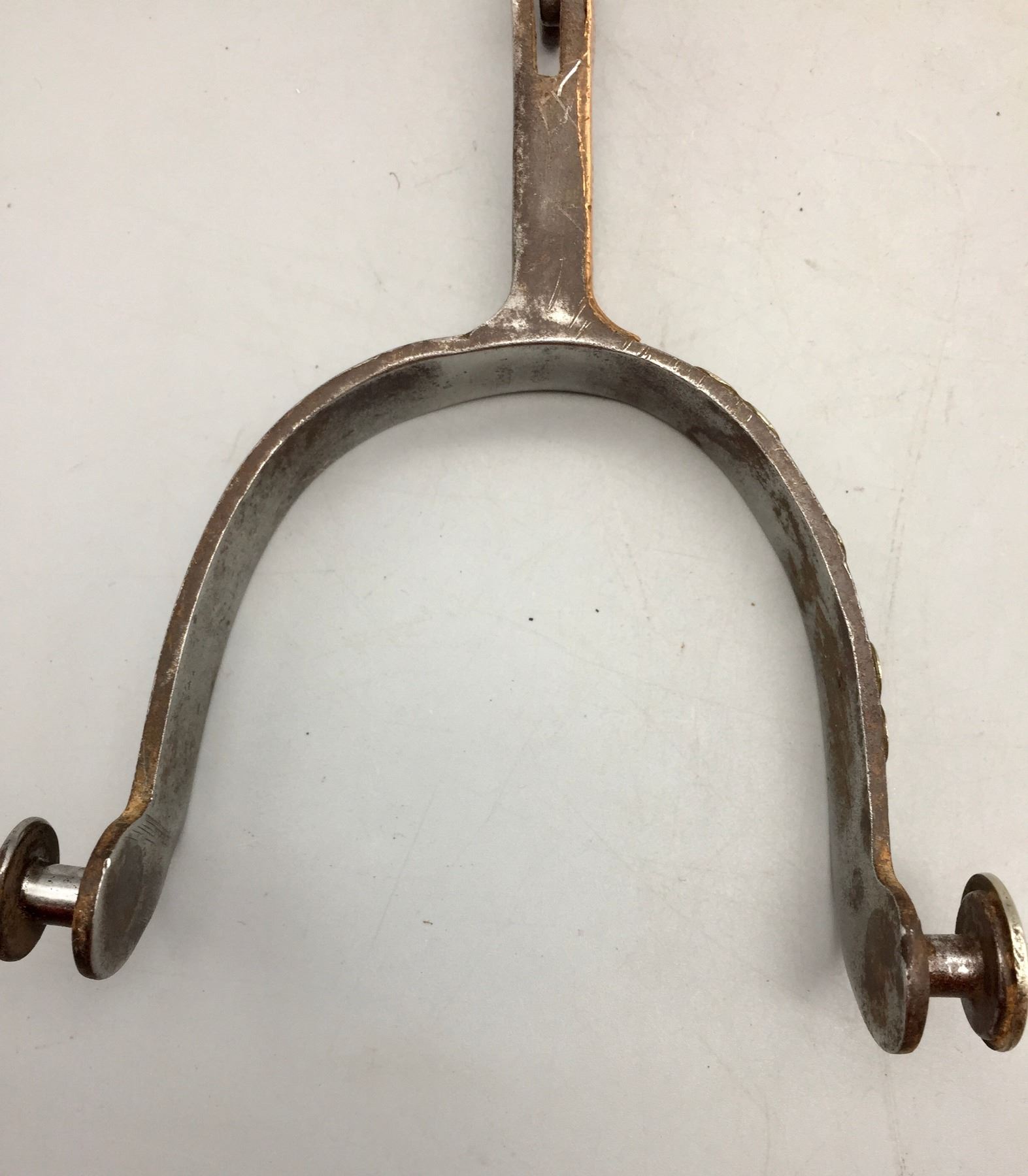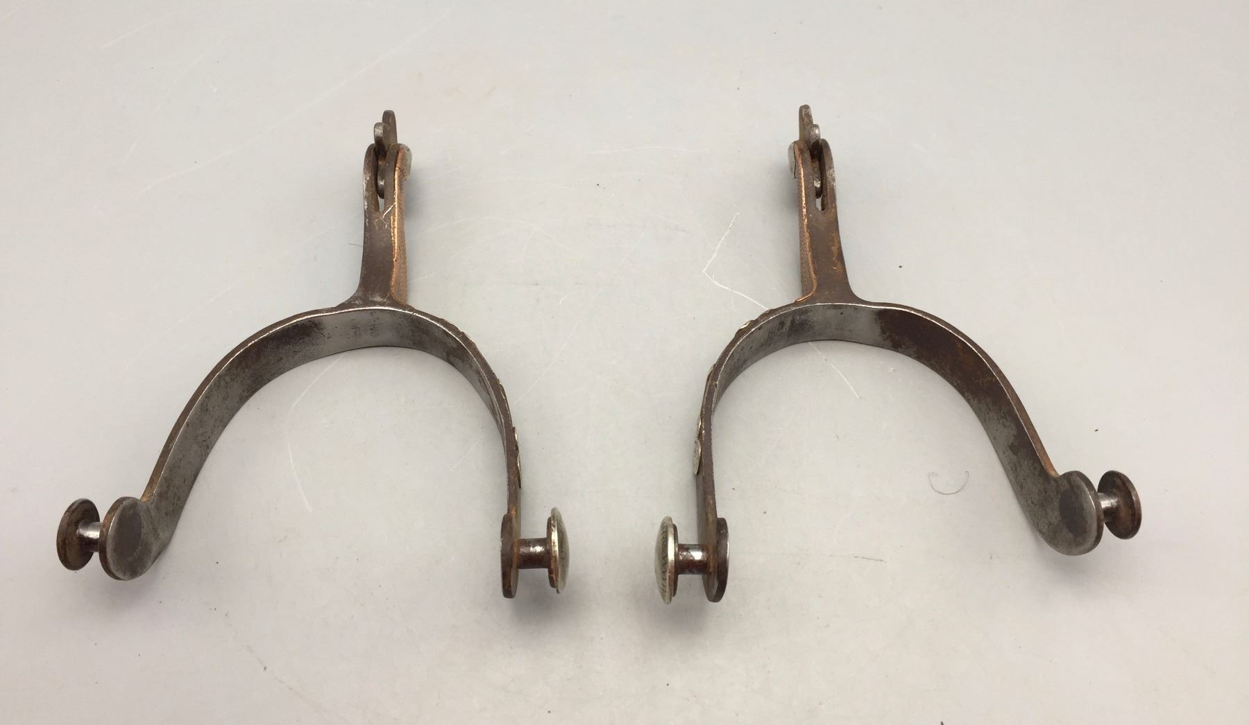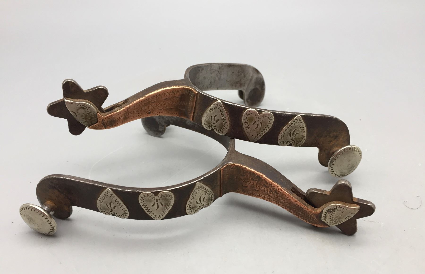 Description: Available for sale in this lot is a pair of Gooseneck spurs featuring single mounted and engraved hearts on the bands and the have engraving on the buttons. Maker: Unknown. Approx. Age: Vintage. Size: 3-1/8” heel, 2-3/4” shank. Condition: Good for their age, normal wear expected. Please look closely at the pictures - they are an important part of our description. Shipping: There will be a $5 handling / packaging fee for shipping this lot. The actual cost of postage will be added on top of that.