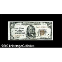 Three High Denomination FRBNs.Fr. 1880-I $50 1929 Feder <B>Three High Denomination FRBNs.</B></I><BR>Fr. 1880-I $50 1929 Federal Reserve Bank Note. Choice CU<BR>Fr. 1880-L $50 1929 Federal Reserve Bank Note. Choice-Gem CU<BR>Fr. 1890-E $100 1929 Federal Reserve Bank Note. VF+.<BR>The scarcest two $50 FRBNs are included in this lot to go along with the scarcest $100.<BR> 3 notes <BR><BR><B>Important notice:</B> Heritage usually auctions material at the rate of 200-250 lots per hour. On some occasions eBay Live bid software or the Internet may not be able to keep up with the pace of the auction. We recommend placing a realistic absentee bid now as insurance to avoid disappointment. Occasionally the auctioneer may eliminate or reject an eBay Live bid, and the auctioneer may also reopen a lot after the close of the eBay live bidding (usually because we missed an audience bid), and may reject your bid even if it shows you as the winning bidder. By bidding via eBay Live, you agree that Heritage may award the lot to another bidder at its sole discretion under the circumstances described above or any other reasonable circumstances. Since eBay bids are not shown to us until we open the lot on the floor, we treat those bids just like floor bids. In most cases the floor responds before the eBay bid is presented to us, due to Internet lag time, so for consistency we have made it a policy that floor bids are always considered first over tie eBay live bids. Also please note that all Heritage lots purchased through eBay Live carry a 20% Buyer's Premium. Please make sure you read the Terms and Conditions before you bid. This lot is being auctioned in conjunction with a live floor auction by Heritage Galleries & Auctioneers. All final auction and invoice information will be supplied by Heritage Galleries & Auctioneers, and all other information should be considered preliminary. Lot:16318