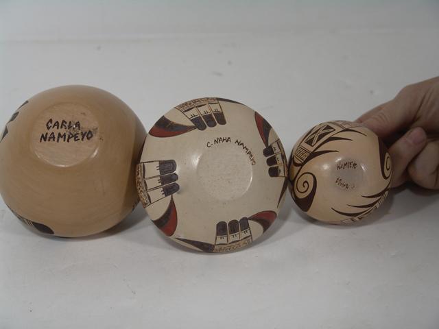 Circa 1970s, C. Naha Nampeyo/Carla Nampeyo, Three beautiful vintage handmade pottery jars, two by C. Naha Nampeyo and one by Carla Nampeyo; all in excellent condition. 2-1/2" - 4"