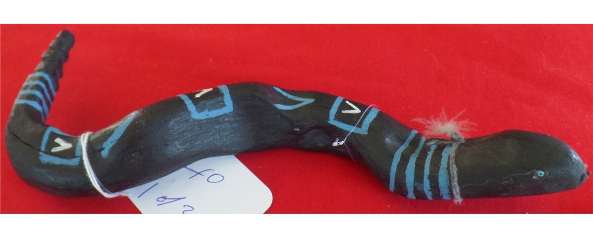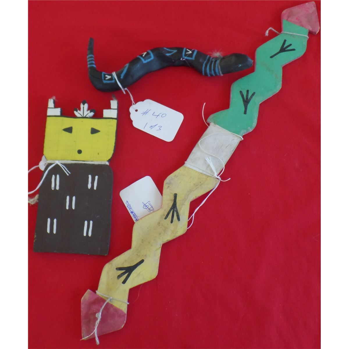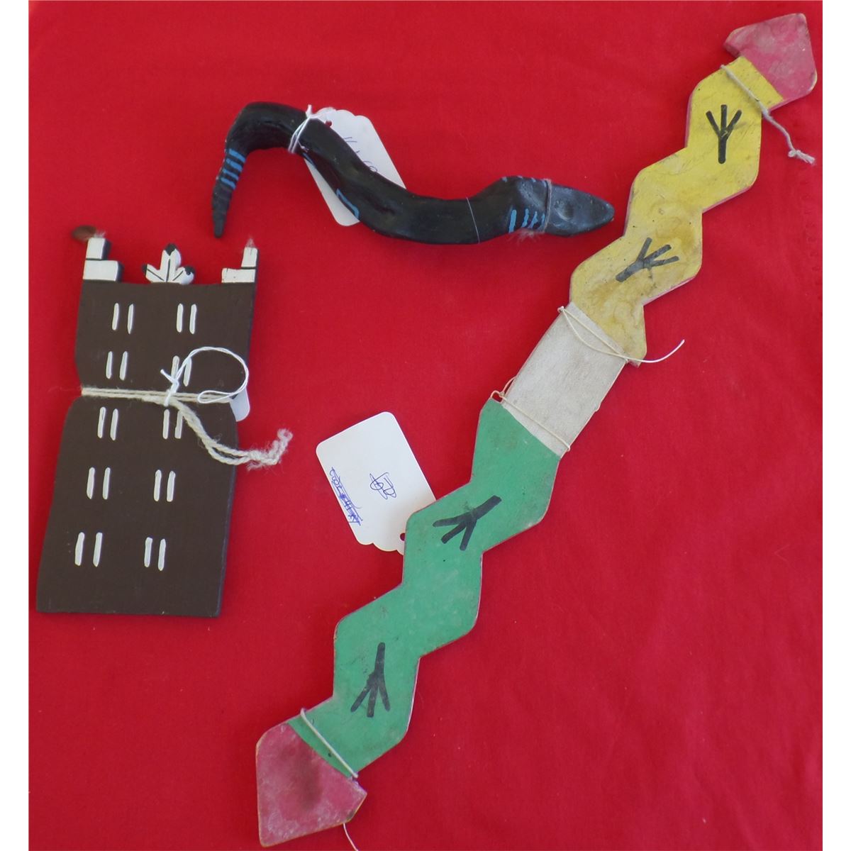 1950's Hopi Wood carvings made from wood and paint. This colorful group includes a wand 20x2 inches, snake 9"x 1" and Kachina 7x4 inches. All have some wear. The Hopi dance wand was danced. Shipping $22.00