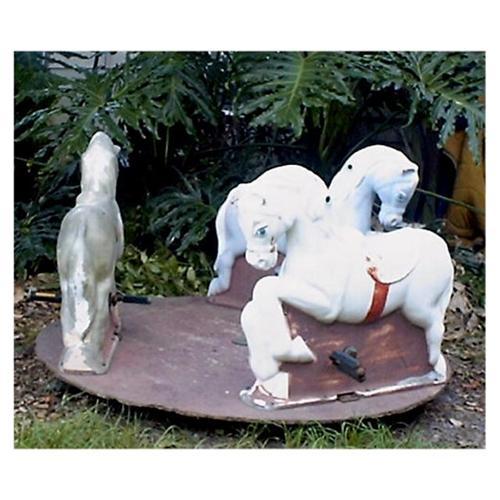 This is a very rare and unique Peddle Merry go-round, made by Joy Mfg. in the 1940-50's. It really works.<p>jYou can restore and paint this great item. We are selling this item UNRESTORED, if you want us to discuss restoring it with you we would be glad to.<p>This Merry go-round would be wonderful in a child's nursery. And can be custom painted in your colors.<p>The Merry go-round measures 45 inches in diameter, and stands about 28 inches tall.<p>Thae base is wood and needs replacing, the horses are a resin or early plastic. The peddle drive works fine!<p>For toddlers to about 6 years old. Your Grandchildren will love you for this forever.<p>We guarantee our horses. The come with a certificate of authenticity and history. We are professional carousel artist and restorers.