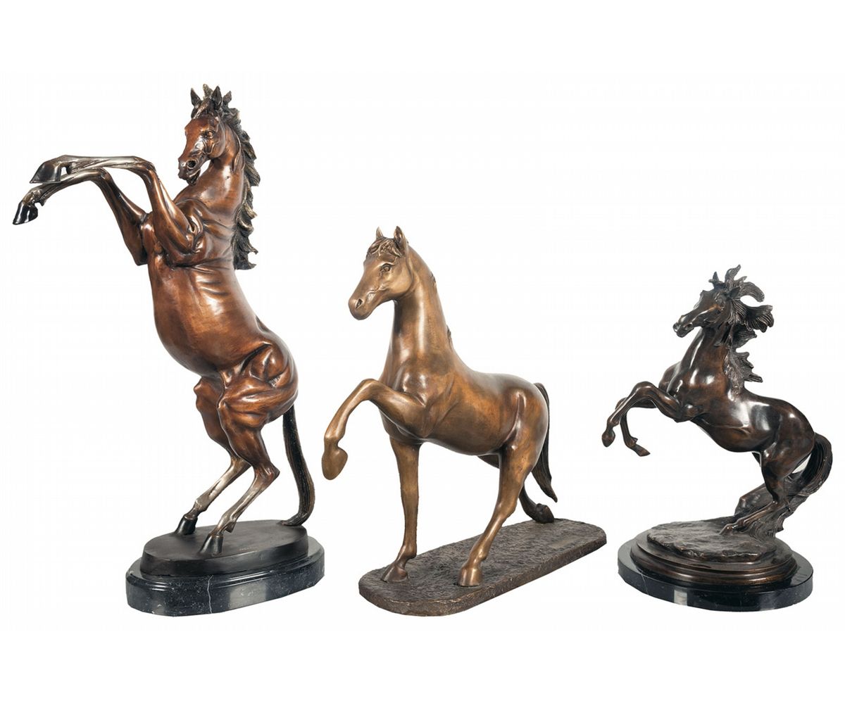 1) Marius' (20th Century) prancing horse bronze. Superb casting of a rampant colt imagery of a stallion rose up on his two hind legs with outstretched 2 upper legs. The horse is shining and is set in a fighting position to defend himself. The hind two legs are standing on the ground bronze base which is fastened to a circular beveled marble plinth. Signed on the base. 2) Dallin signed horse with leg up bronze sculpture. This great almost classic bronze of a thoroughbred stallion being commanded to place one leg up in the air while the other 3 legs rest on the bronze ground base. Measures 21" wide x 6" deep x 18 1/2" tall. 3) Dancing horse bronze sculpture. This bronze depicts a wild stallion with two legs rearing up to the sky while his hind legs rest on ground level. Signed on the bronze base Dallin. Measures 11" wide x 15" long x 17" tall.