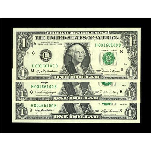 <B>Three Identical Radars From Three Different Series.</B></I><BR>Each note boasts serial number H00166100B.<BR>Fr. 1911-H $1 1981 Federal Reserve Note. <B>Gem Crisp Uncirculated</B></I><BR>Fr. 1915-H $1 1988A Federal Reserve Note. <B>Gem Crisp Uncirculated</B></I><BR>Fr. 1919-H $1 1993 Federal Reserve Note. <B>Gem Crisp Uncirculated.</B></I><BR><BR><b>Shipping:</b> Coin/Currency (<a target="_blank" href="http://www.heritageauctions.com/common/shipping.php">view shipping information</a>)
